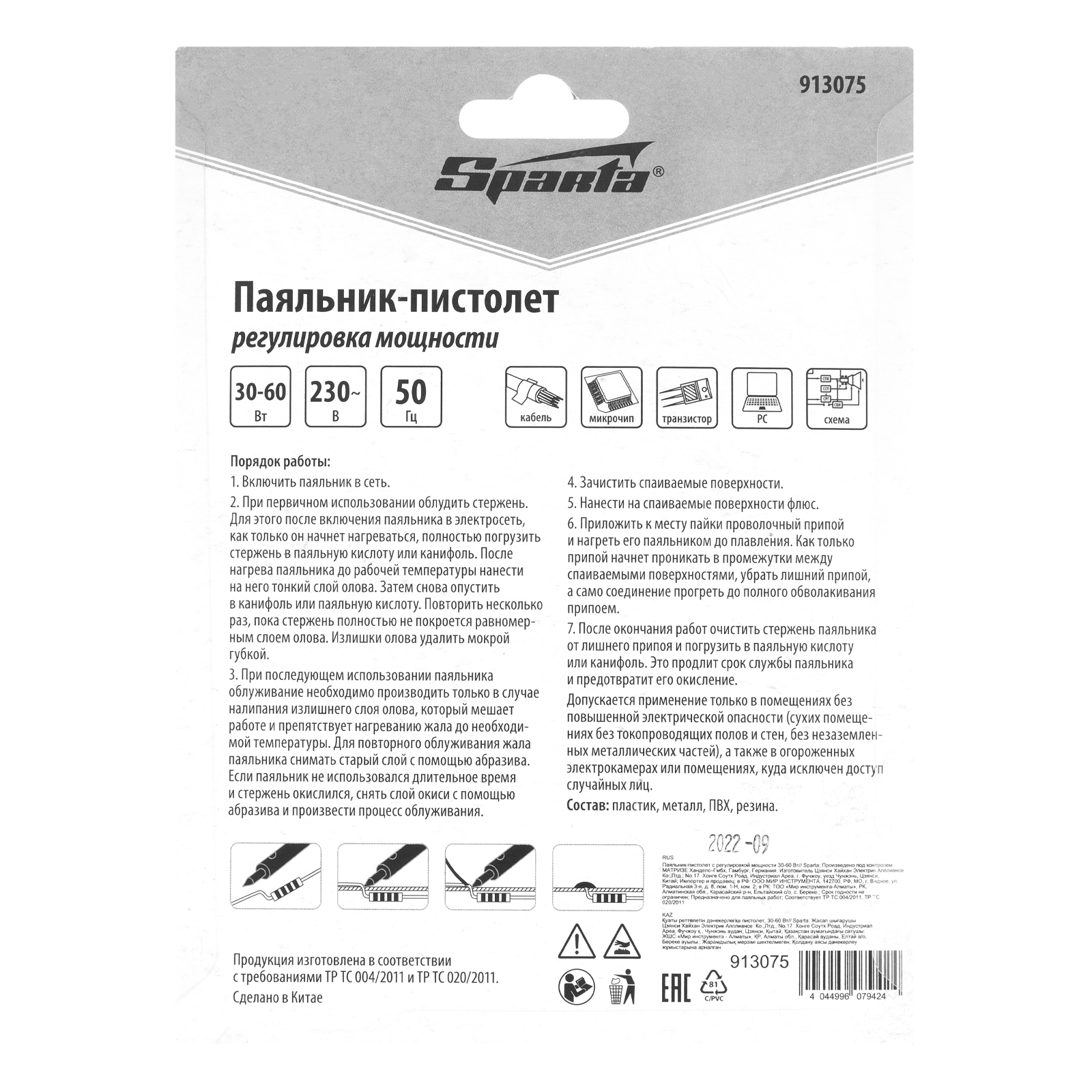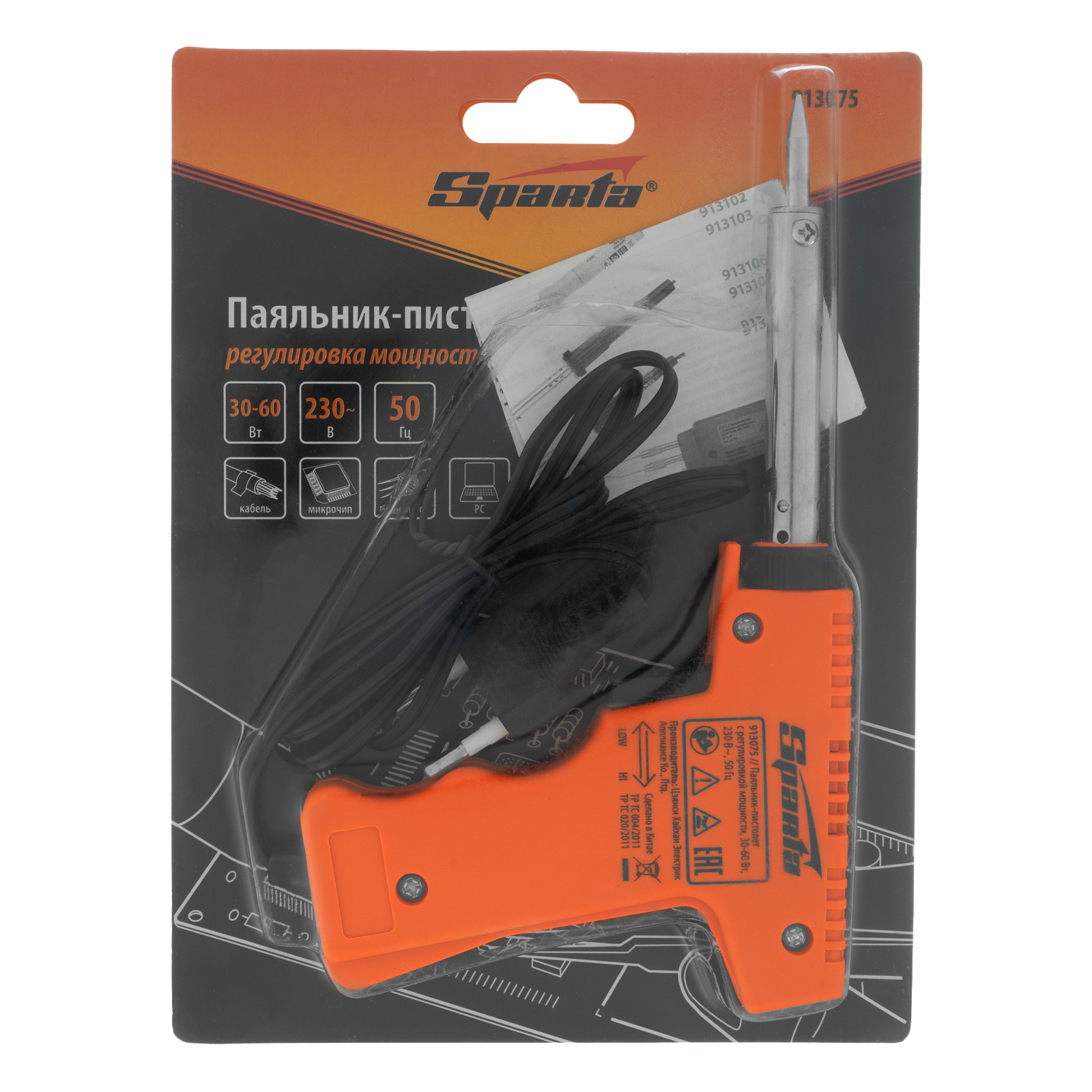 Паяльник-пистолет с регулировкой мощности 30-60 Вт, 220 В Sparta в Москве