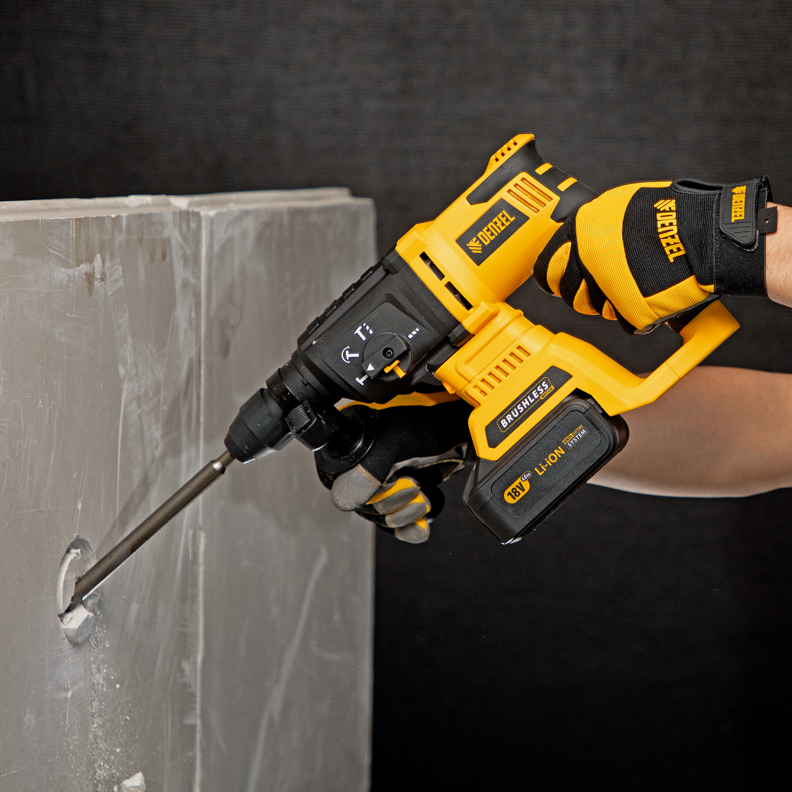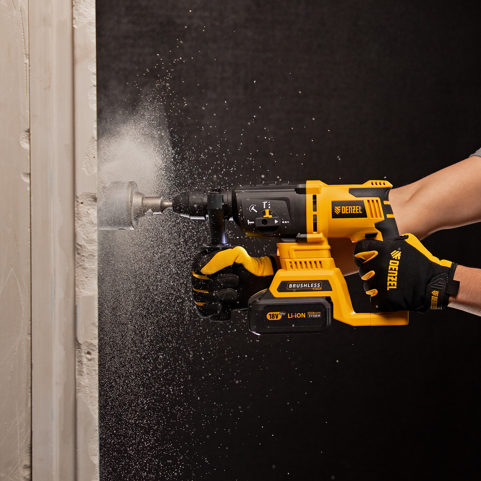 - Универсальность — к перфоратору подходит любой Li-Ion аккумулятор единой платформы Denzel Battery System 18V.