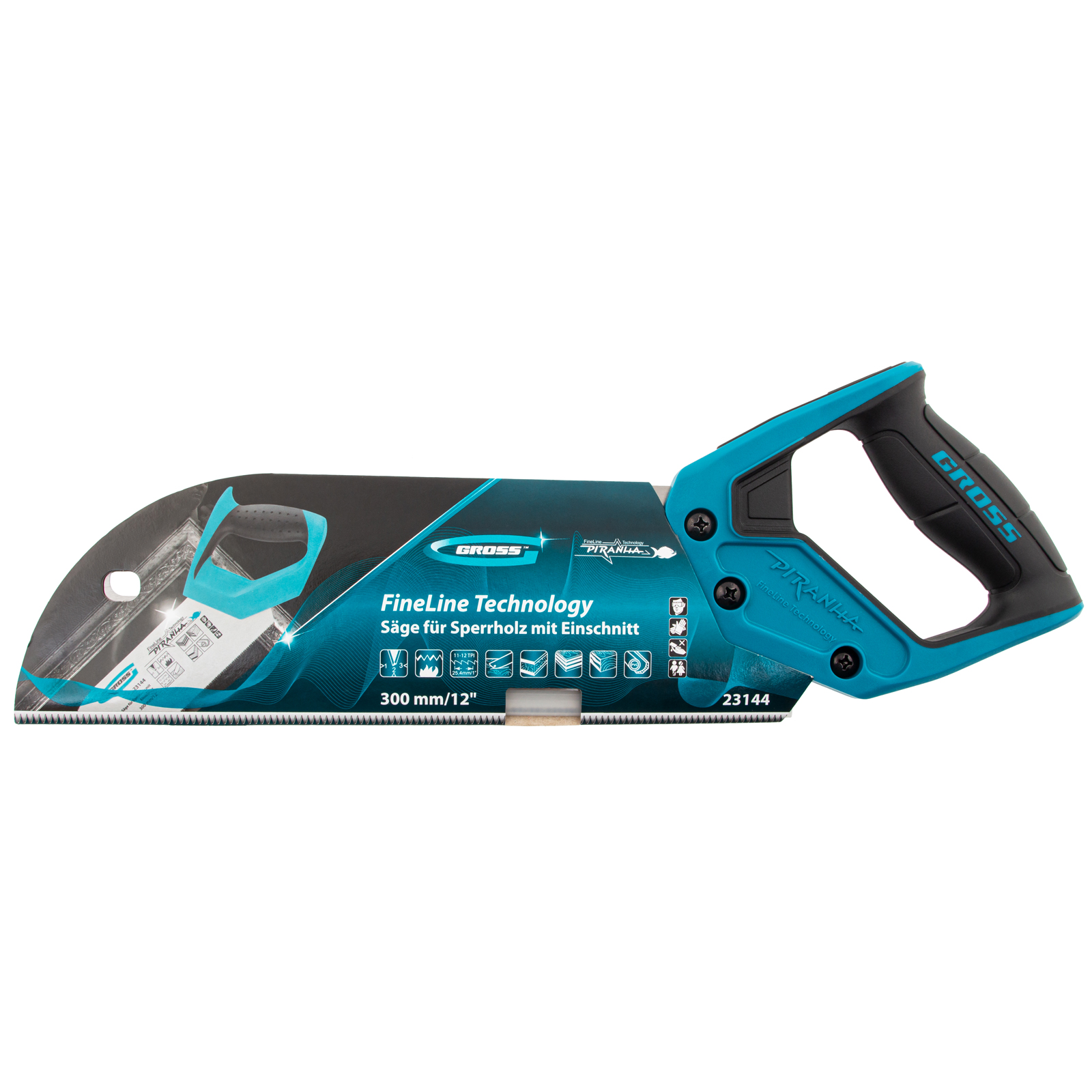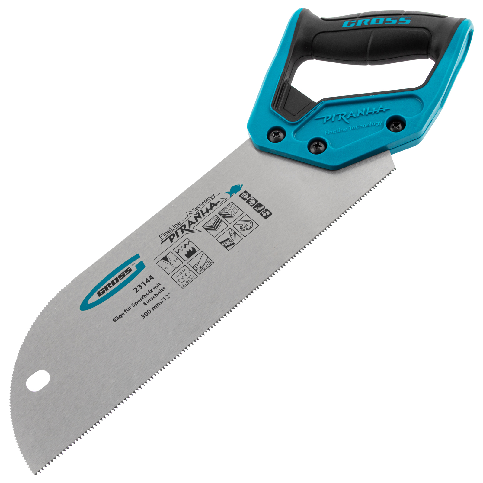 Пила для фанеры с запилом Gross PIRANHA 23144 с полотном размером 300 мм / 12", с калеными зубьями с шагом 11-12 TPI и 3D-заточкой, используется для распиловки древесины, фанеры, ДВП и ПВХ в продольном и поперечном направлении. Характеризуется высокой производительностью. Рабочая кромка с мелкими зубьями выполняет ровный гладкий рез. Запил в передней части полотна облегчает работу с заготовками. Пила будет полезна в столярной мастерской.