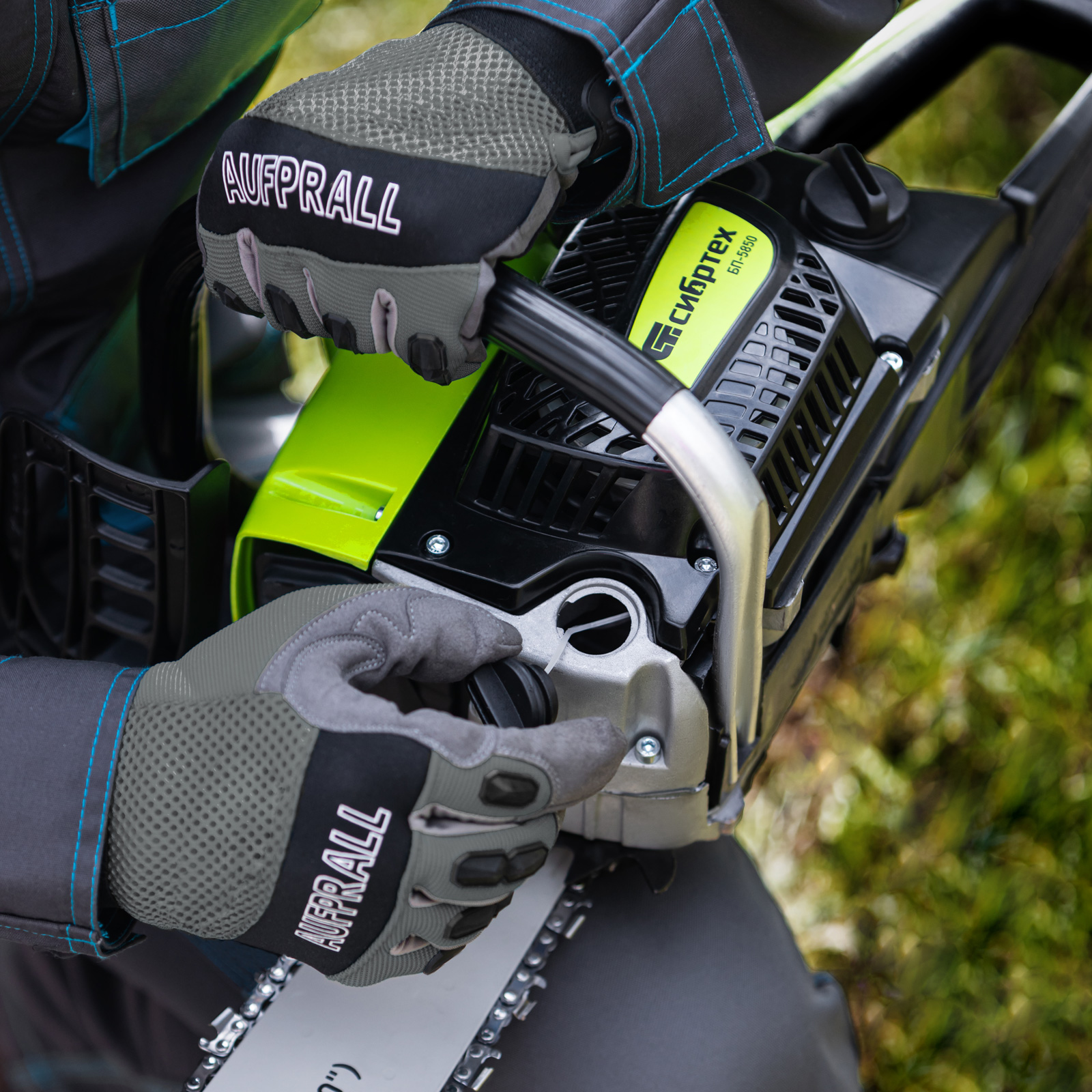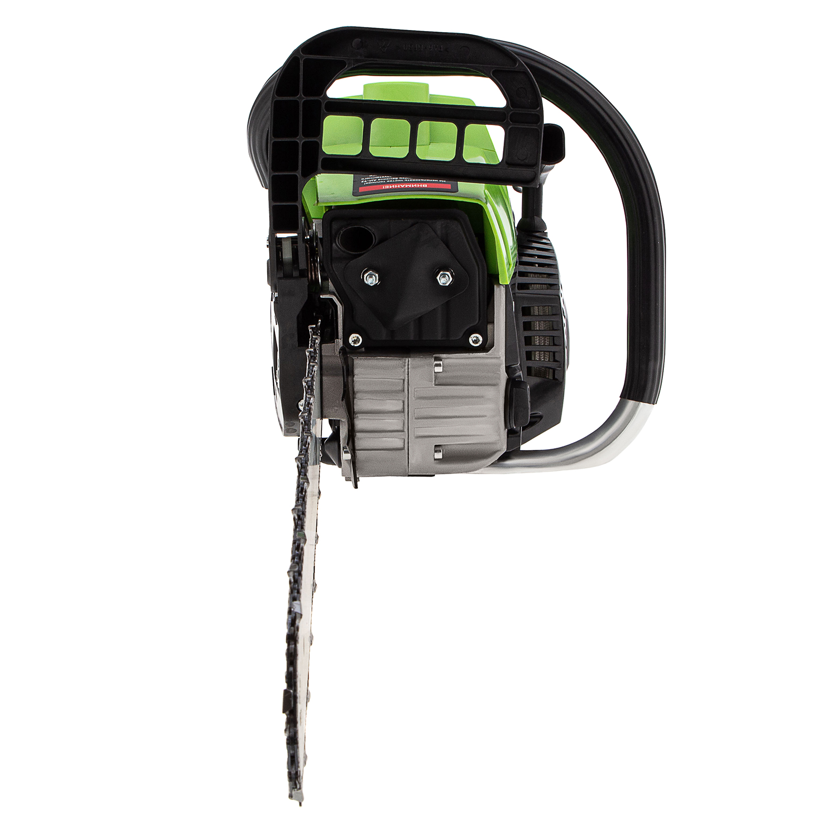 - Безопасность — пила оснащена блокировкой от случайного запуска и тормозом цепи, который моментально срабатывает при отскоке инструмента.
