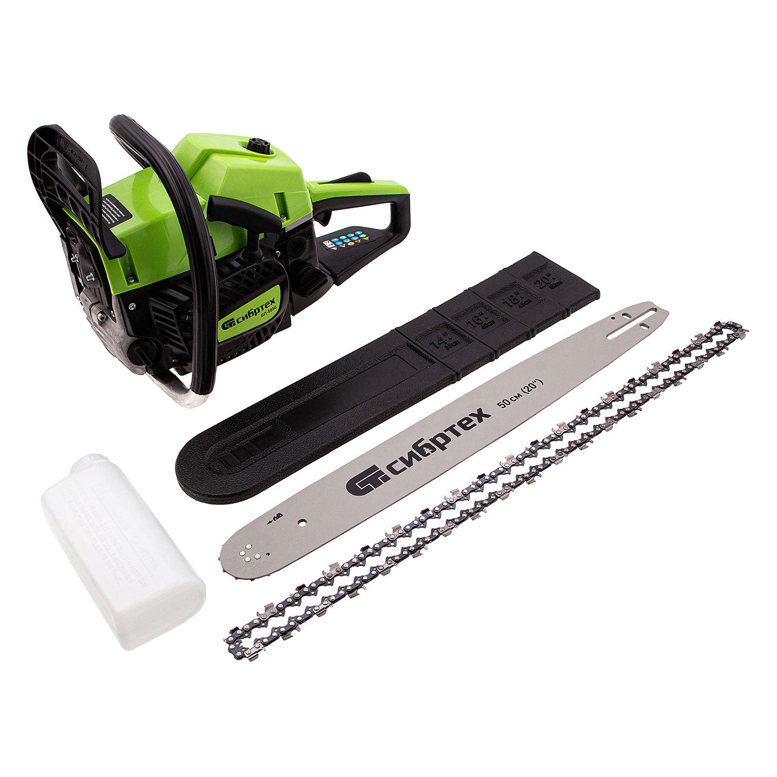 Пила цепная бензиновая - 1 штШина - 1 штЧехол шины - 1 штЦепь - 1 штЕмкость для приготовления смеси - 1 штКомплект инструментов - 1 штРуководство по эксплуатации и гарантийный талон - 1 шт |