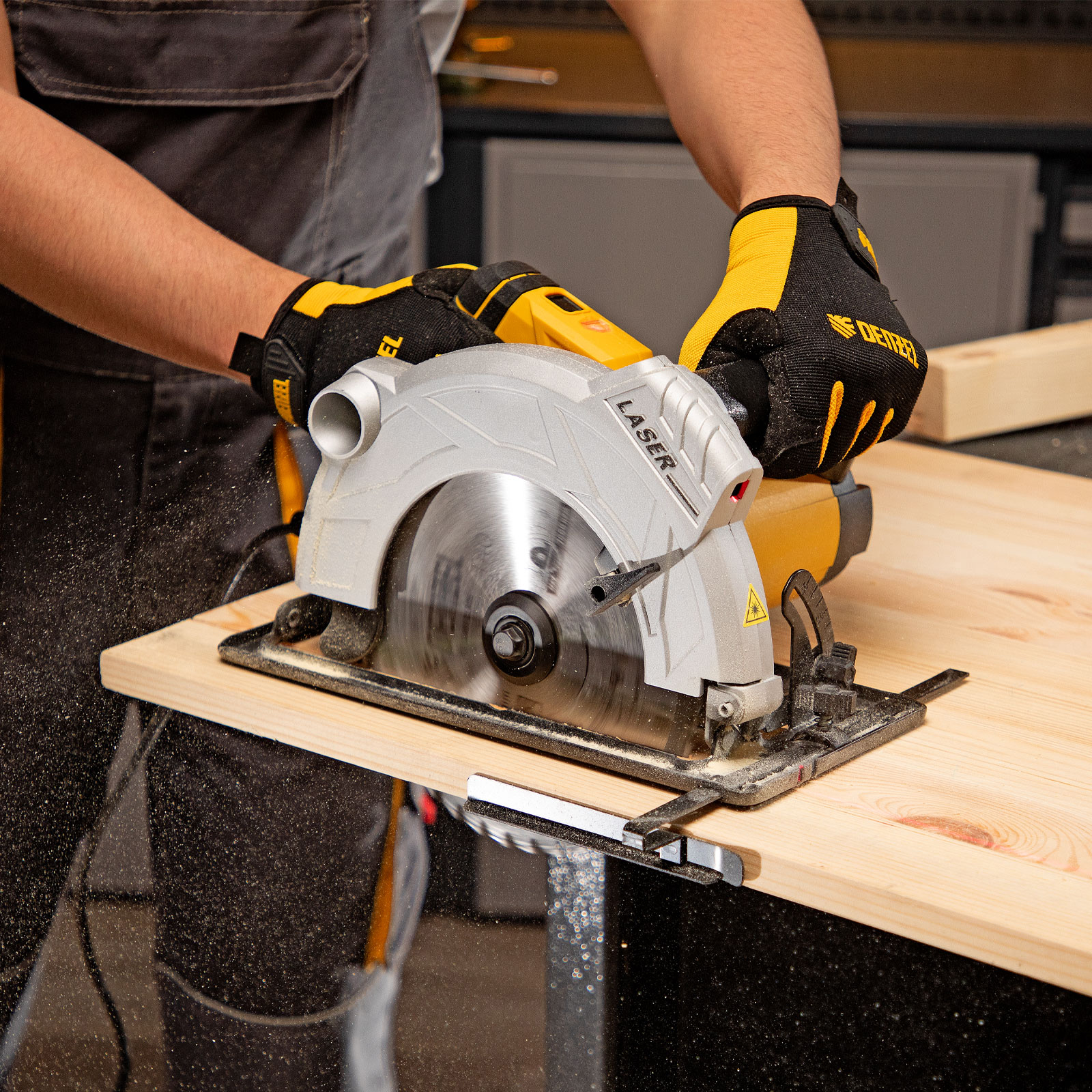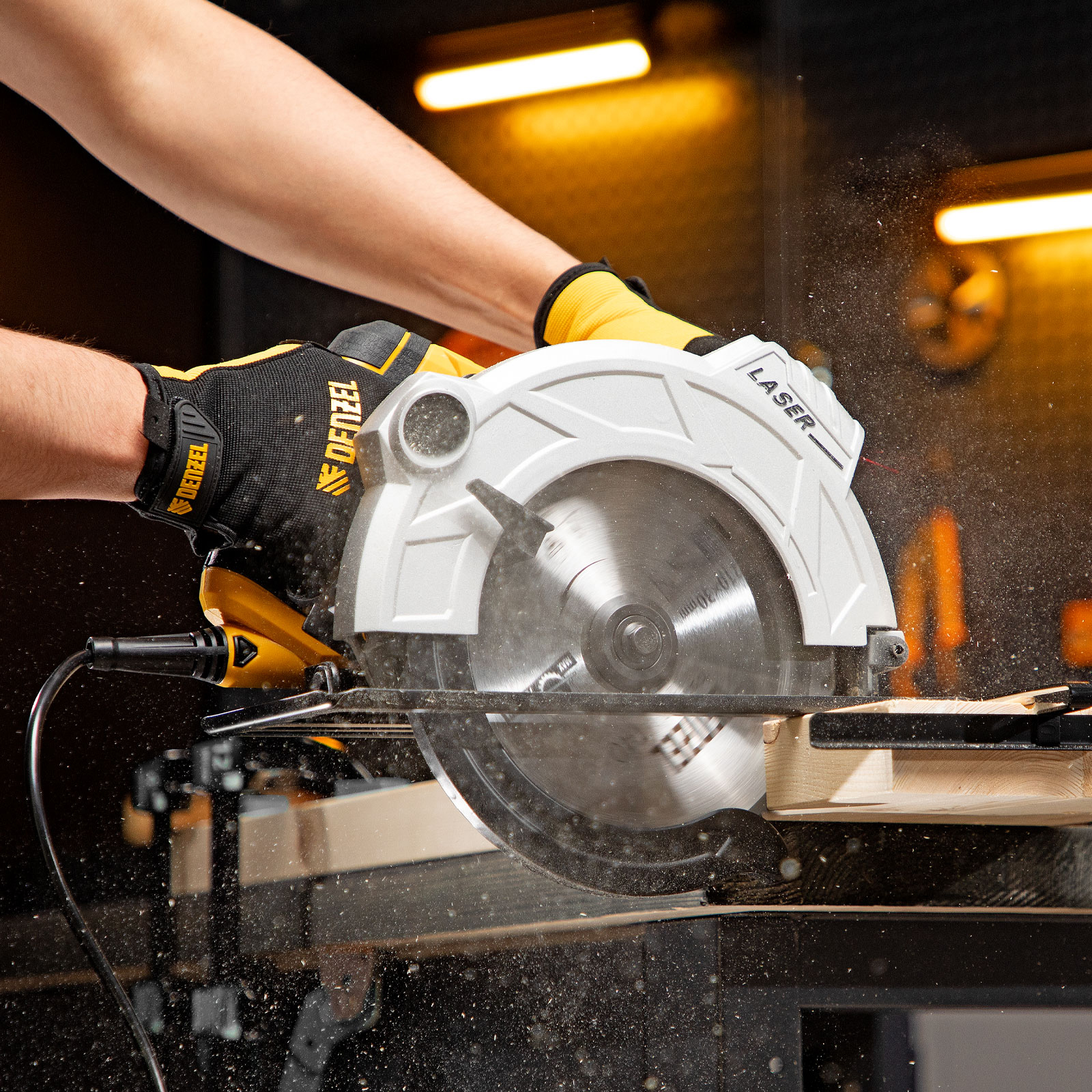 - Высокая точность — лазерный указатель, показывающий линию предстоящего среза, и стальная параллельная направляющая помогают осуществлять ровные прямые пропилы без дополнительной разметки.