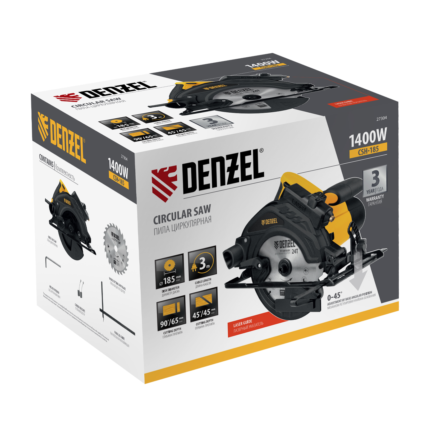 Циркулярная пила Denzel CSH-185 27304 мощностью 1400 Вт используется с дисками диаметром 185 мм и предназначена для распила древесных материалов: досок, фанеры, ДСП, ДВП. Глубина пропила под углом 90° составляет 65 мм. Диск вращается со скоростью 5500 об/мин, что обеспечивает высокую производительность. Инструмент пригодится в мастерской, на даче и строительной площадке.