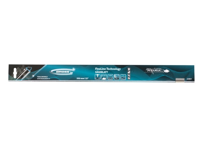 Пильное полотно Gross «PIRANHA» 22861 длиной 550 мм, с каленым зубом с 2D-заточкой, 14 TPI — режущий элемент для прецизионного стусла, применяемый для распила под углом заготовок из дерева, мягкого металла и пластика. Мелкие зубья с шагом 14 TPI позволяют получить точный и чистый рез. Полотно используется для пиления плинтусов, реек, дверных наличников и других деталей.