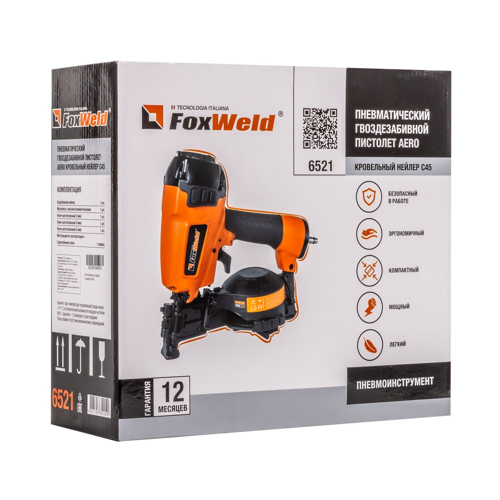 Кровельный пневматический гвоздезабивной пистолет или нейлер AERO C45 - мощный профессиональный инструмент для надежного забивания гвоздей в любую породу дерева. Предназначен для монтажа мягкой черепицы, кровельной дранки, обустройства заборов из мягких материалов и утепления черновых полов. Устройство позволяет регулировать глубину забивания гвоздей. Контактный предохранитель защитит от случайного выстрела. Удобный спусковой крючок обеспечит быструю работу. Инструмент использует кровельные барабанные гвозди CRN длиной от 19 до 45 мм. Поворотный дефлектор, находящийся на крышке инструмента, позволит выбрать наиболее комфортное для пользователя и окружающих направление выхода воздуха. Эргономичная прорезиненная рукоятка снижает усталость и дискомфорт во время работы. Для работы инструмента необходим воздушный компрессор и подготовленная воздушная магистраль. AERO C45 имеет следующие рабочие параметры - рабочее давление - 4,8 - 8,0 бар и расход воздуха - 1,2 л / выстрел (при 6,0 бар). Для быстрого и надежного подключения оснащается быстросьемным разъемом - Rapid M "папа".