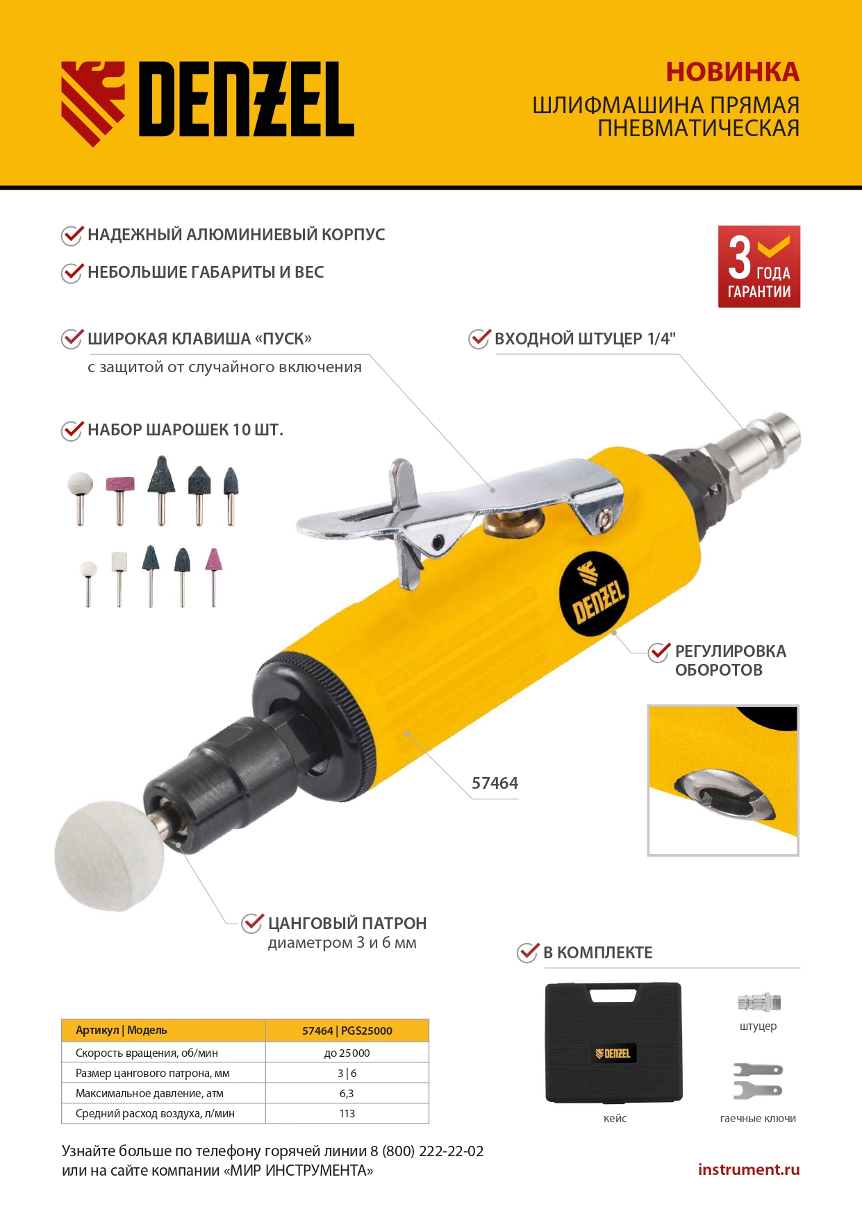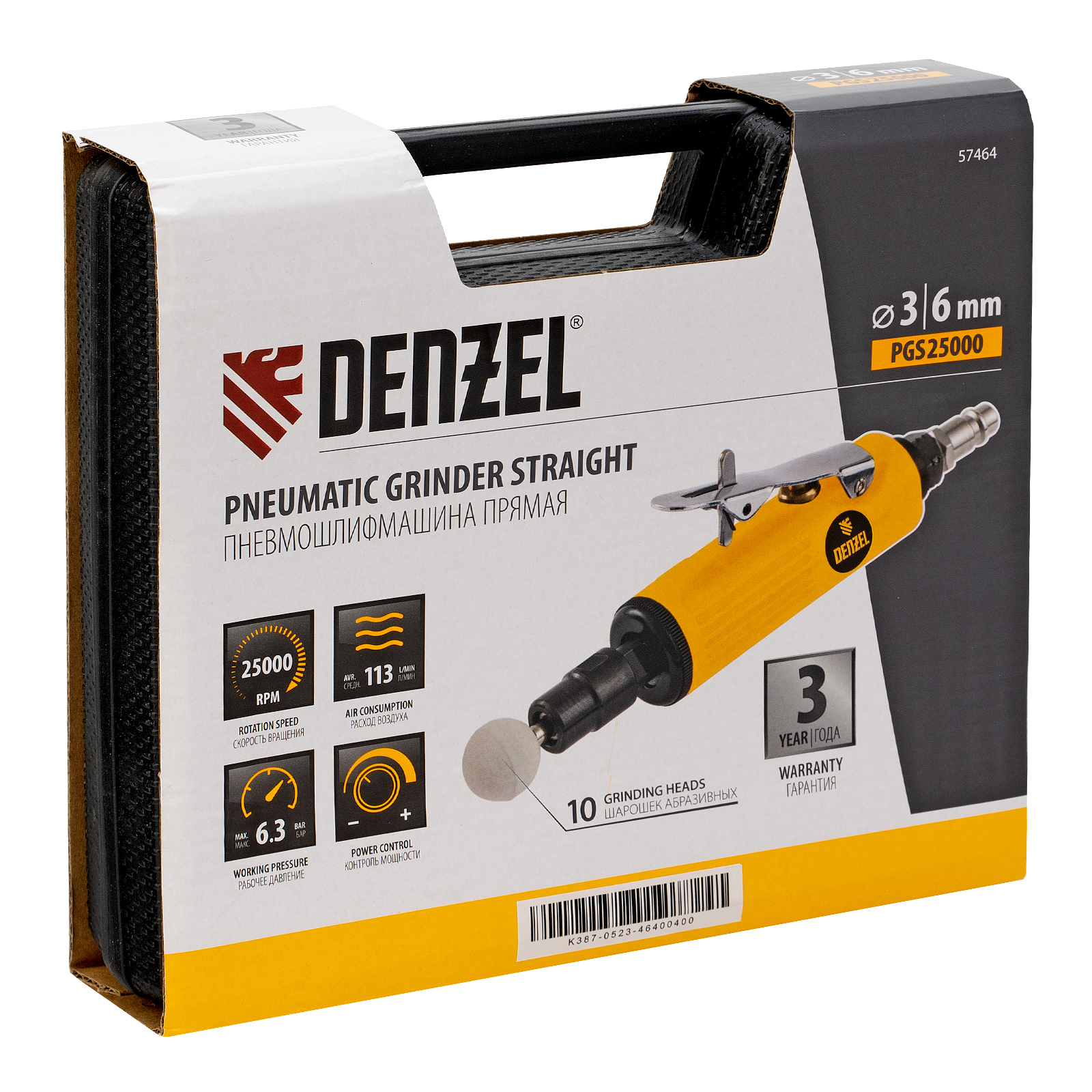 Пневмошлифмашина прямая PGS25000, 25000 об/мин, 10 шлиф. камней, цанга - 3, 6 мм, 113 л/мин Denzel в Москве