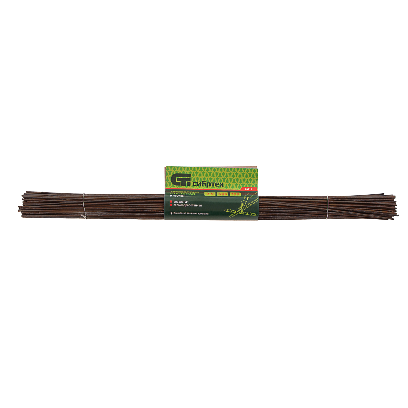 Вязальная стальная проволока в прутках Сибртех 84919, термообработанная, длиной 400 мм и диаметром 2 мм, 100 шт., предназначена для вязки стальных сеток и арматуры. Пригодится на строительных площадках для армирования конструкций из железобетона.