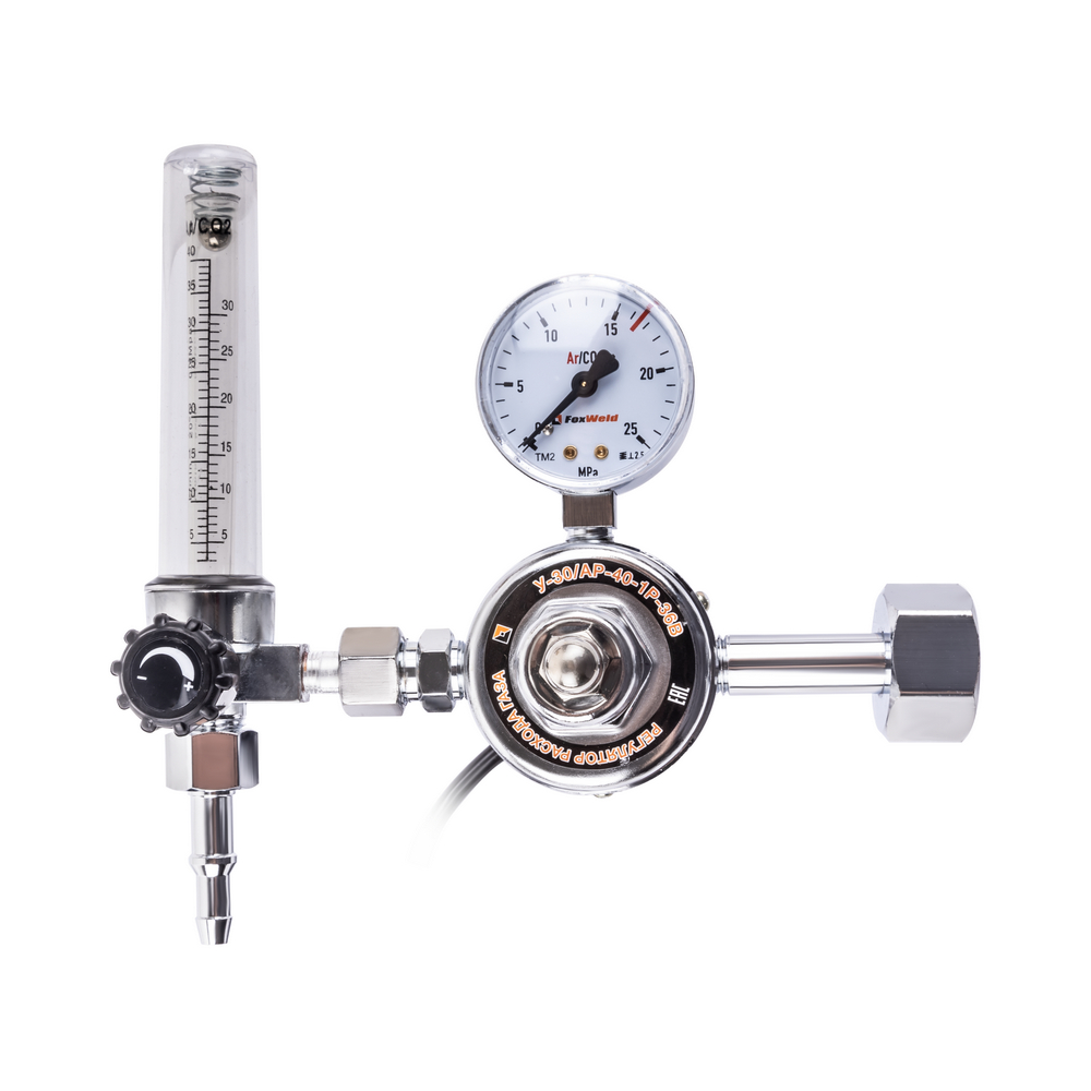 Регулятор расхода газа У-30/АР-40-1P-36В с подогревателем на 36 Вольт используется для понижения и выравнивания давления на выходе из баллона до рабочего уровня, регулировки расхода газа и поддержания заданного уровня на протяжении проведения работ. Нагреватель газа нужен для предотвращения замерзания механизмов регулятора при больших расходах газа или при низких температурах окружающей среды. Корпус выполнен из латуни и покрыт никелем - материал прочен и не дает искр. Входное давление отражено на манометре высокого давления, а регулировка осуществляется с помощью вентиля, характеристики расхода показывает ротаметр на выходе. Регулятор расхода газа необходим при выполнении работ с газовым оборудованием, при проведении сварочных работ, резке и пайке металлов, газовом напылении.БЕЗОПАСНОСТЬ РАБОЧЕГО ПРОЦЕССА: Корпус из латуни обеспечивает безопасность в работе. Материал прочен и не дает искр при использовании. Надежное крепление не допускает протечки газа во внешнюю среду.ВЫСОКАЯ ЭФФЕКТИВНОСТЬ: Газовый регулятор обеспечивает меньший расход рабочих газов при газосварочном процессе, поддерживает заданный уровень давления до окончания работы и экономит газ в баллоне.ВНЕШНИЕ РЕГУЛИРОВКИ: Регулятор имеет вентиль регулировки подачи газа. Для качественного выполнения газосварочных работ необходимо создать рабочую среду и контролировать расход газа, поступающий из баллона. Вентиль снижает или понижает поступающее давление - можно настроить необходимое рабочее давление на выходе и проконтролировать процесс с помощью манометра.ВСТРОЕННЫЙ МАНОМЕТР: Встроенный манометр давления на входе показывает давление поступающего из баллона газа. С помощью манометра удобно отслеживать уровень давления и задать необходимый объём для работы. Регулировка давления подачи газа осуществляется с помощью наружного вентиля.КОМПЛЕКТАЦИЯ: Регулятор расхода газа У-30/АР-40-1P-36В с подогревателем – 1 шт.; Индивидуальная упаковка – 1 шт.; Инструкция по эксплуатации – 1 шт.*Производитель оставляет за собой право менять комплектацию оборудования.