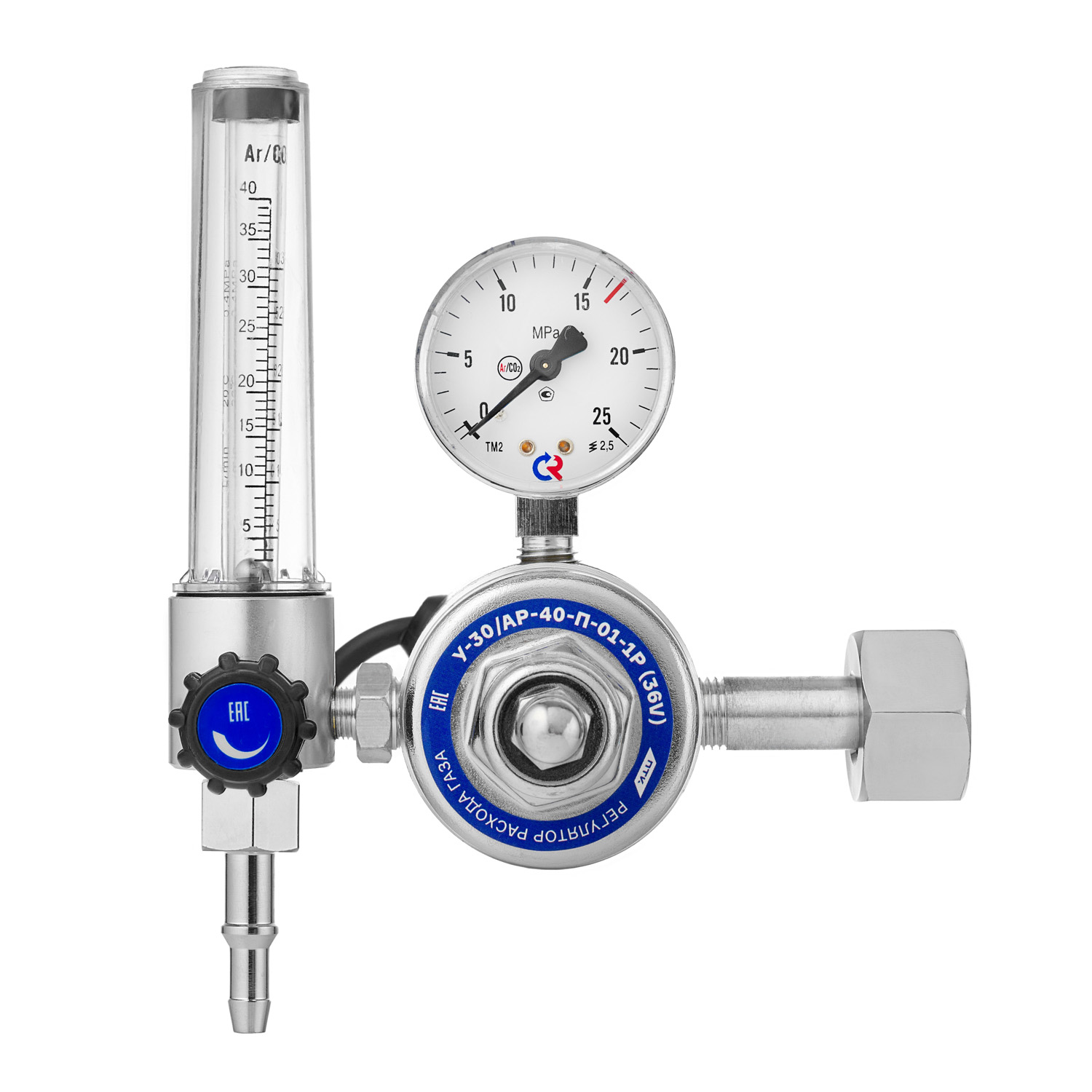 Регулятор расхода газа с подогревателем У-30/АР-40-П-01-1Р (36V) предназначен для понижения газа и автоматического поддержания постоянным заданного расхода при питании постов и установок в среде защитных газов. Регулятор обеспечивает тонкую настройку и стабильное поддержание заданного рабочего давления (расхода).