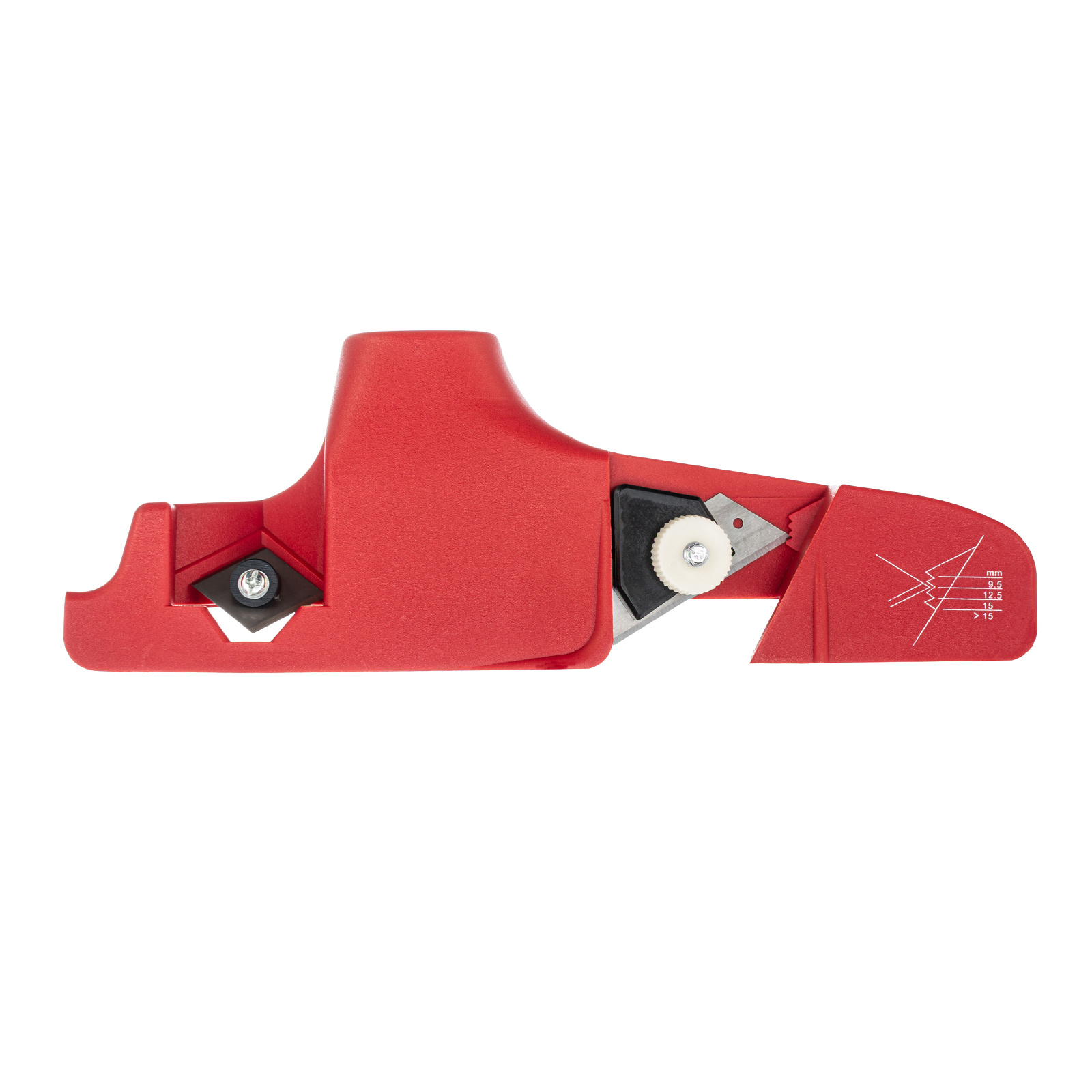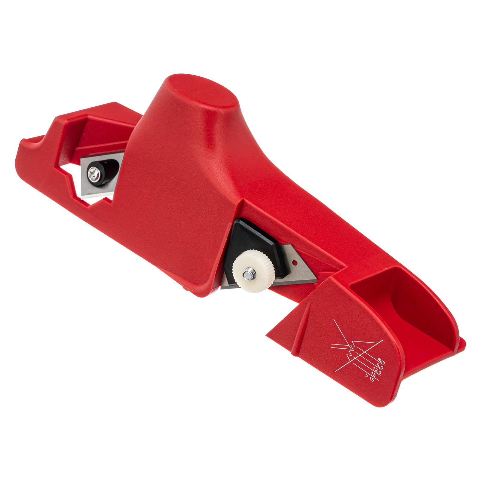 Пластиковый кромочный рубанок для гипсокартона MTX 879055 позволяет обрезать края гипсокартонных листов под углом 22,5° или 45°, для чего на нем установлены 2 ножа. Положение переднего лезвия, снимающего фаску под углом 22,5°, регулируется в зависимости от толщины листа — 9,5, 12,5, 15 мм или более. Инструмент используется для проведения отделочных работ.