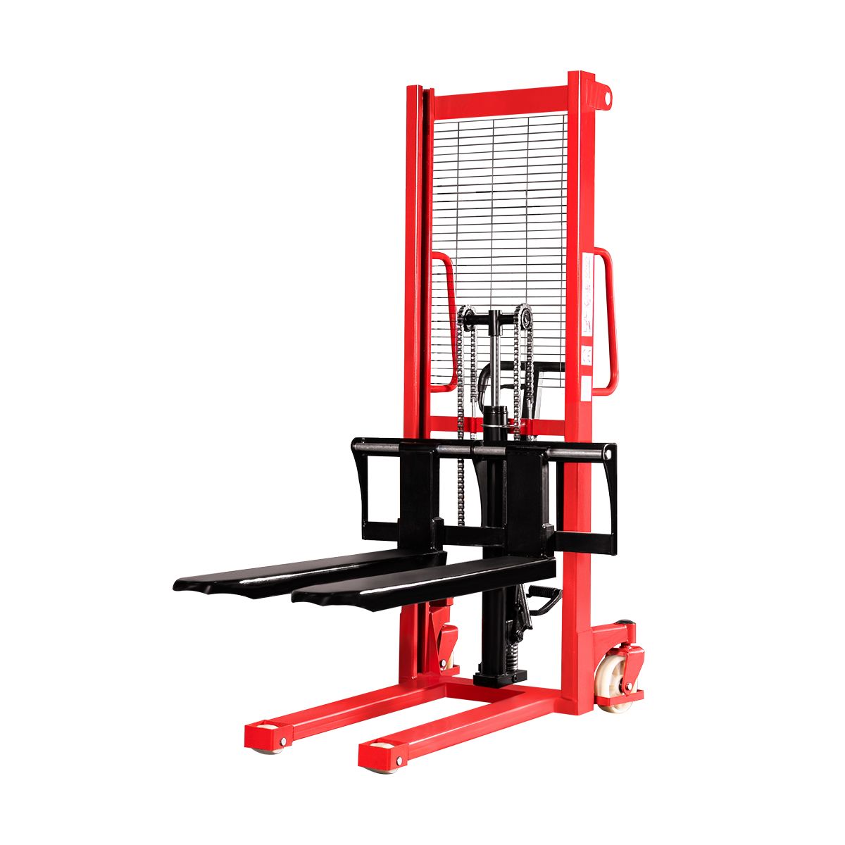 На штабелере установлены раздвижные вилы, позволяющие работать с нестандартными поддонами и негабаритными грузами. Разборный гидроцилиндр облегчает обслуживание штабелера. Колеса установлены из нейлона и имеют стояночный тормоз.