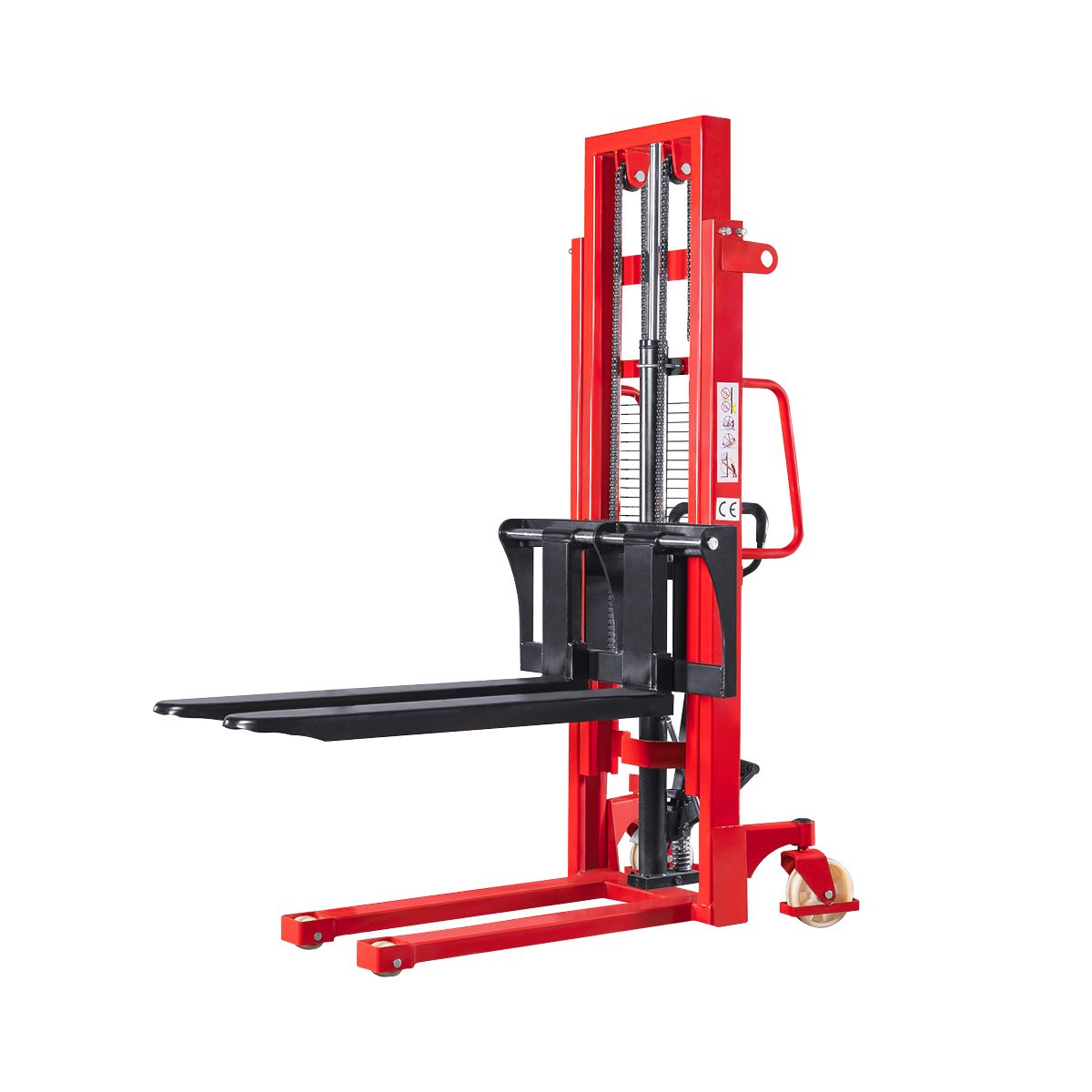 На штабелере установлены раздвижные вилы, позволяющие работать с нестандартными поддонами и негабаритными грузами. Разборный гидроцилиндр облегчает обслуживание штабелера. Колеса установлены из нейлона и имеют стояночный тормоз.