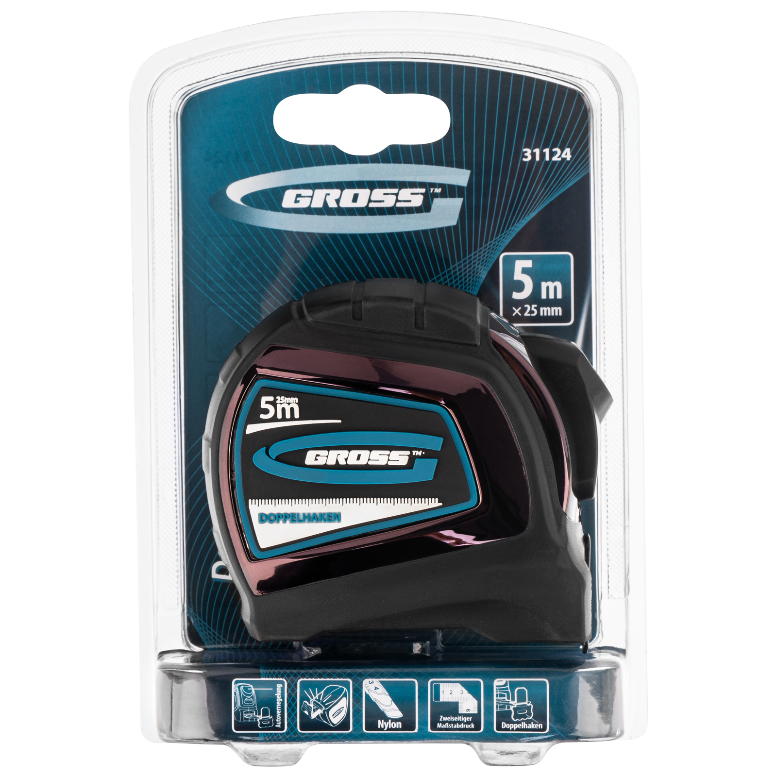 Автоматическая рулетка Gross «Doppelhaken» 31124 с двухсторонним зацепом, лентой размером 5 м x 25 мм, с двухсторонней шкалой и нейлоновым покрытием, предназначена для проведения измерений стен, полов, различных материалов и конструкций. Пригодится на строительной площадке и в быту, благодаря широкой упругой ленте удобна для работы в труднодоступных местах.