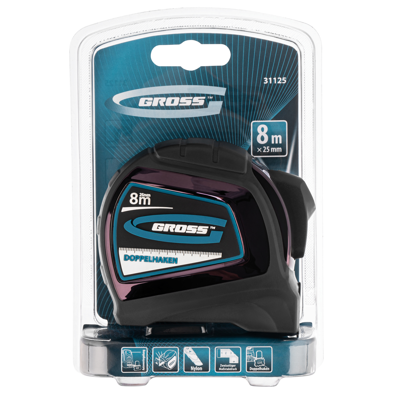 Автоматическая рулетка Gross «Doppelhaken» 31125 с двухсторонним зацепом, лентой размером 8 м x 25 мм, с двухсторонней шкалой и нейлоновым покрытием, предназначена для проведения измерений стен, полов, различных материалов и конструкций. Пригодится на строительной площадке и в быту, благодаря широкой упругой ленте удобна для работы в труднодоступных местах.