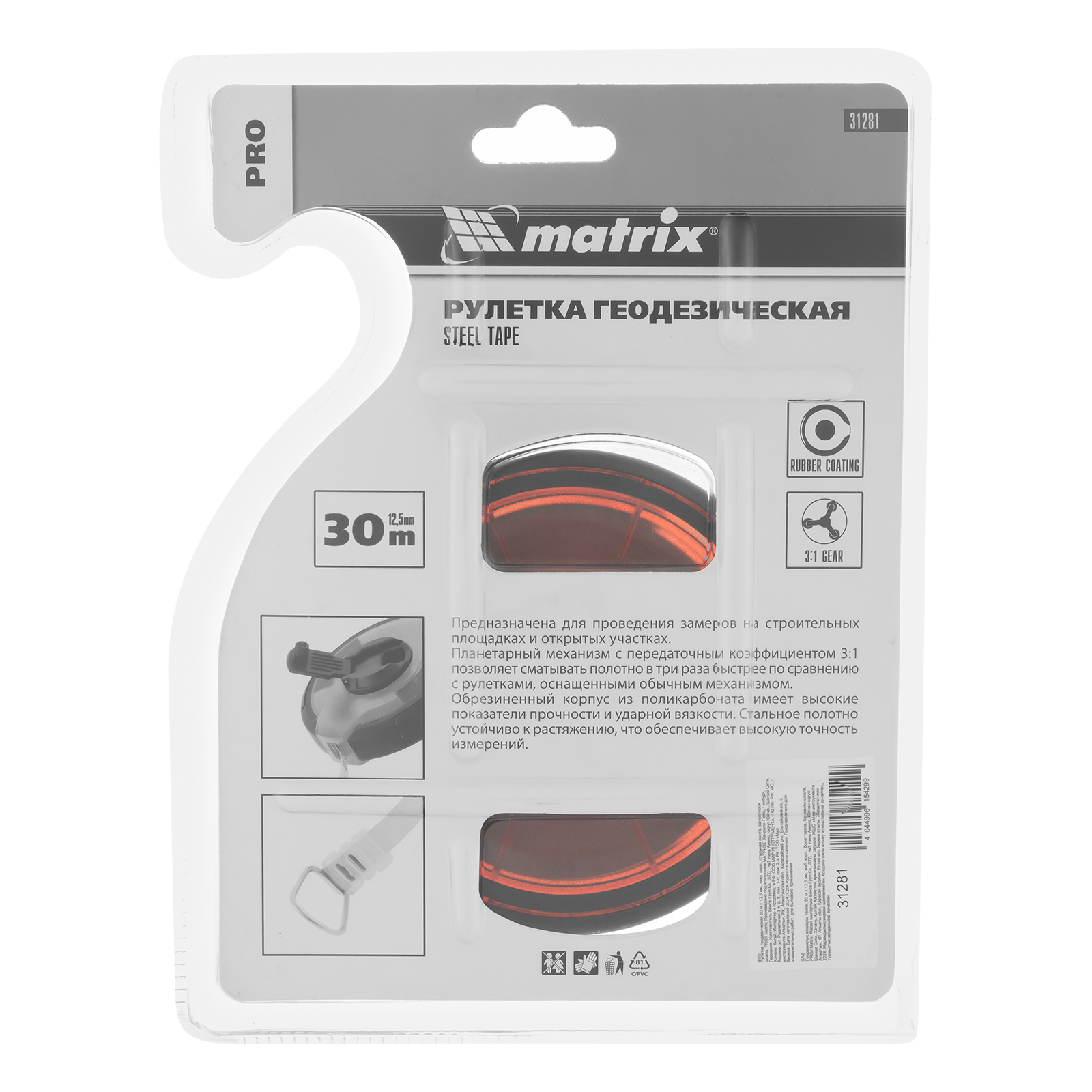Рулетка геодезическая 30 м х 12,5 мм, закрытый корпус, стальная лента, односторонняя шкала, Pro Matrix в Москве