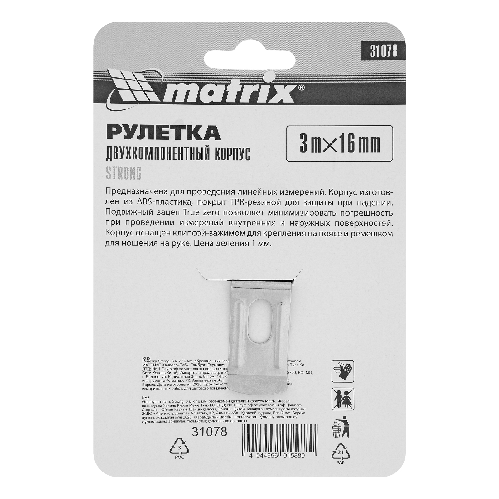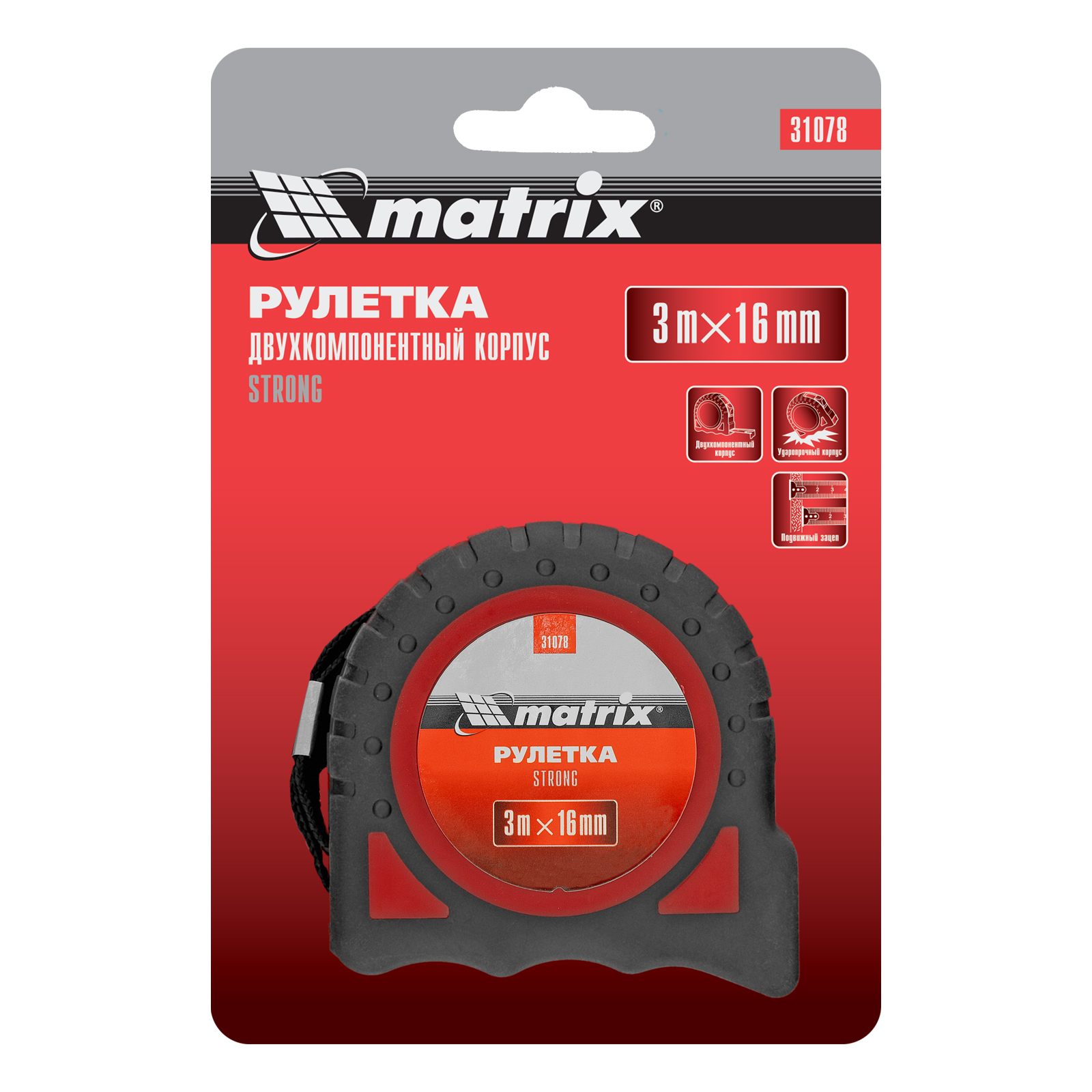 Рулетка Strong,3 м х 16 мм,обрезиненный корпус Matrix в Москве