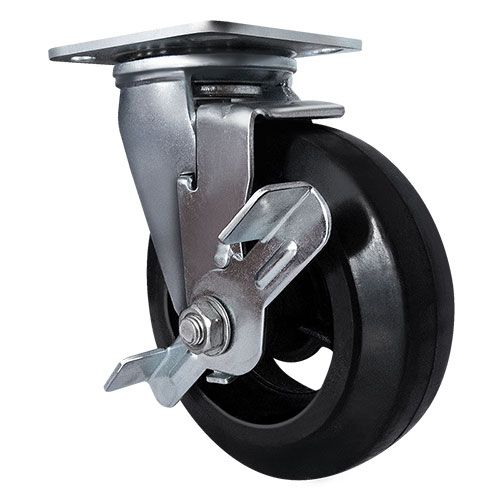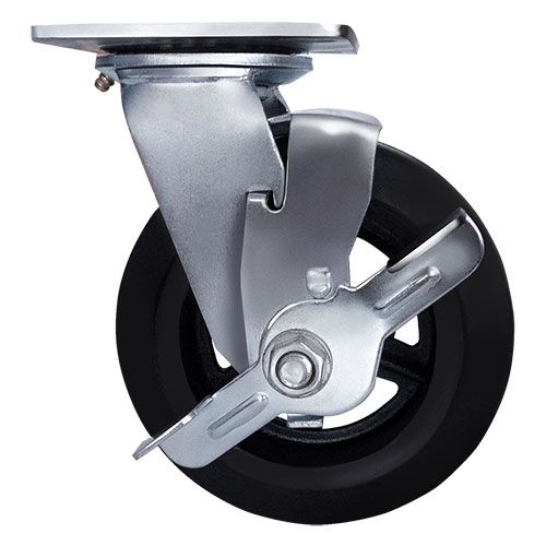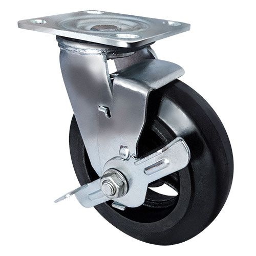 Колесо большегрузное обрезиненное поворотное с тормозом SCDB55 предназначено для строительного, коммунального и складского оборудования. Шинка выполнена из термопластичной черной резины. Материал отличается высокой износостойкостью и сопротивляемостью к неблагоприятным воздействиям внешней среды. Колесо не требовательно к качеству напольного и дорожного покрытия. Обод выполнен из чугуна и оснащен смазочным ниппелем. В оси установлен роликовый подшипник. В поворотном механизме установлен двухрядный шариковый подшипник с пресс-масленкой. Кронштейн — сварной, изготовлен из оцинкованной листовой стали. Диапазон температур — от -35ºC до +50ºC.