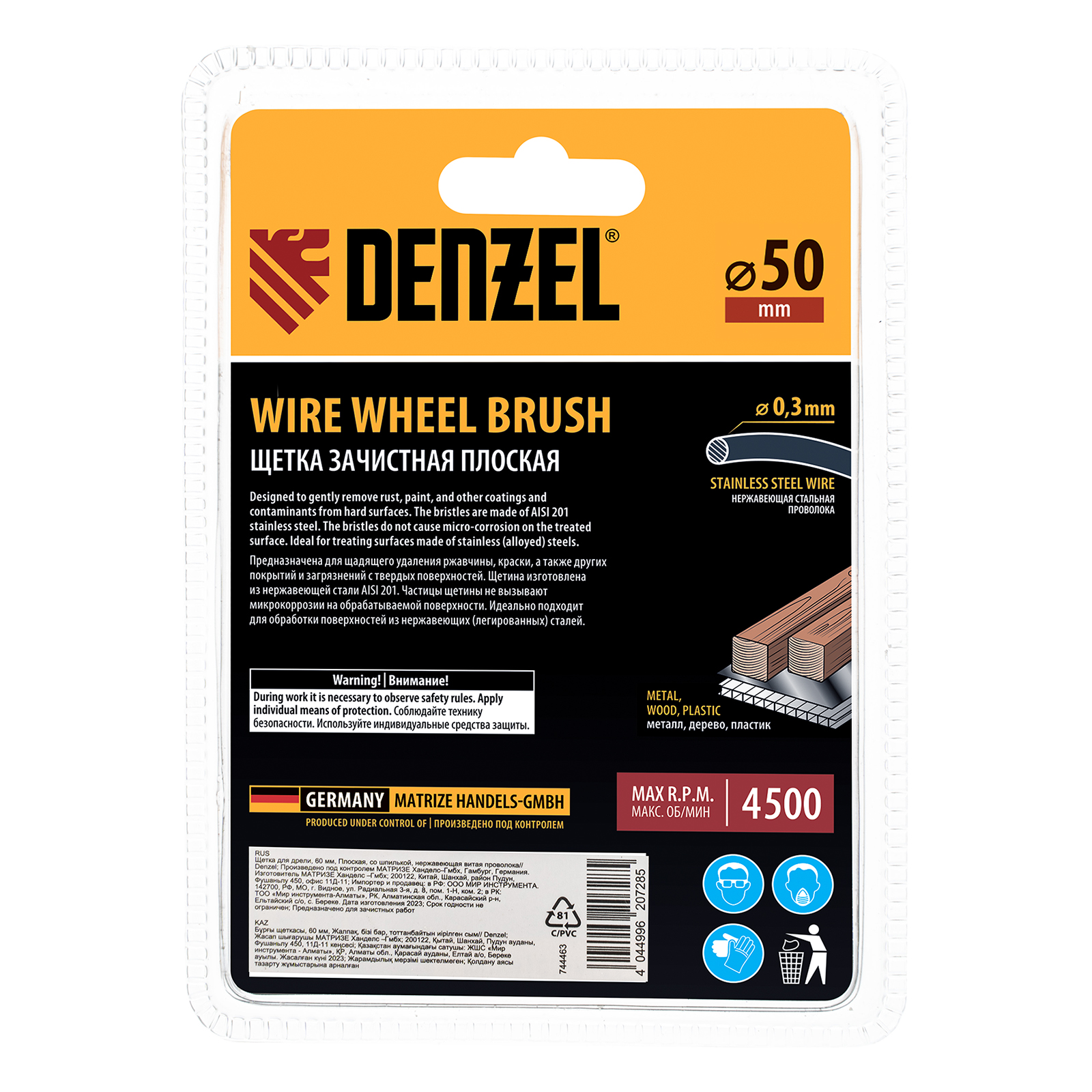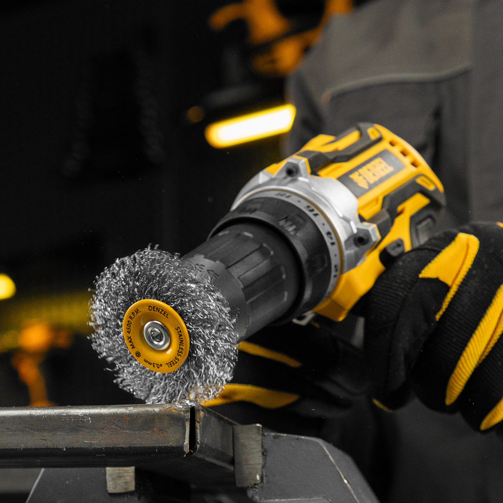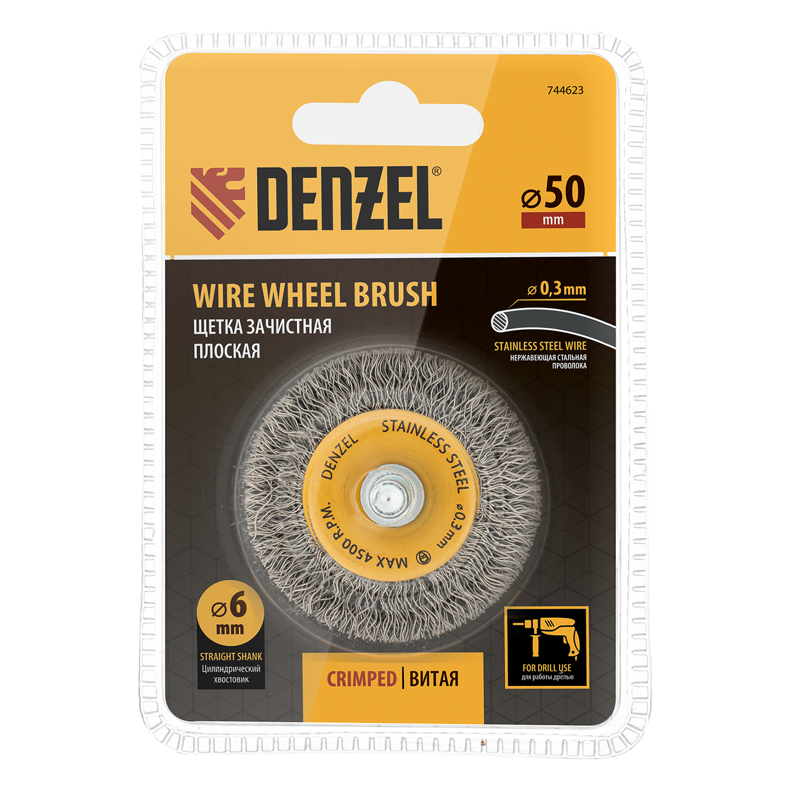 Щетка для дрели, 50 мм, Плоская, со шпилькой, нержавеющая витая проволока Denzel в Москве