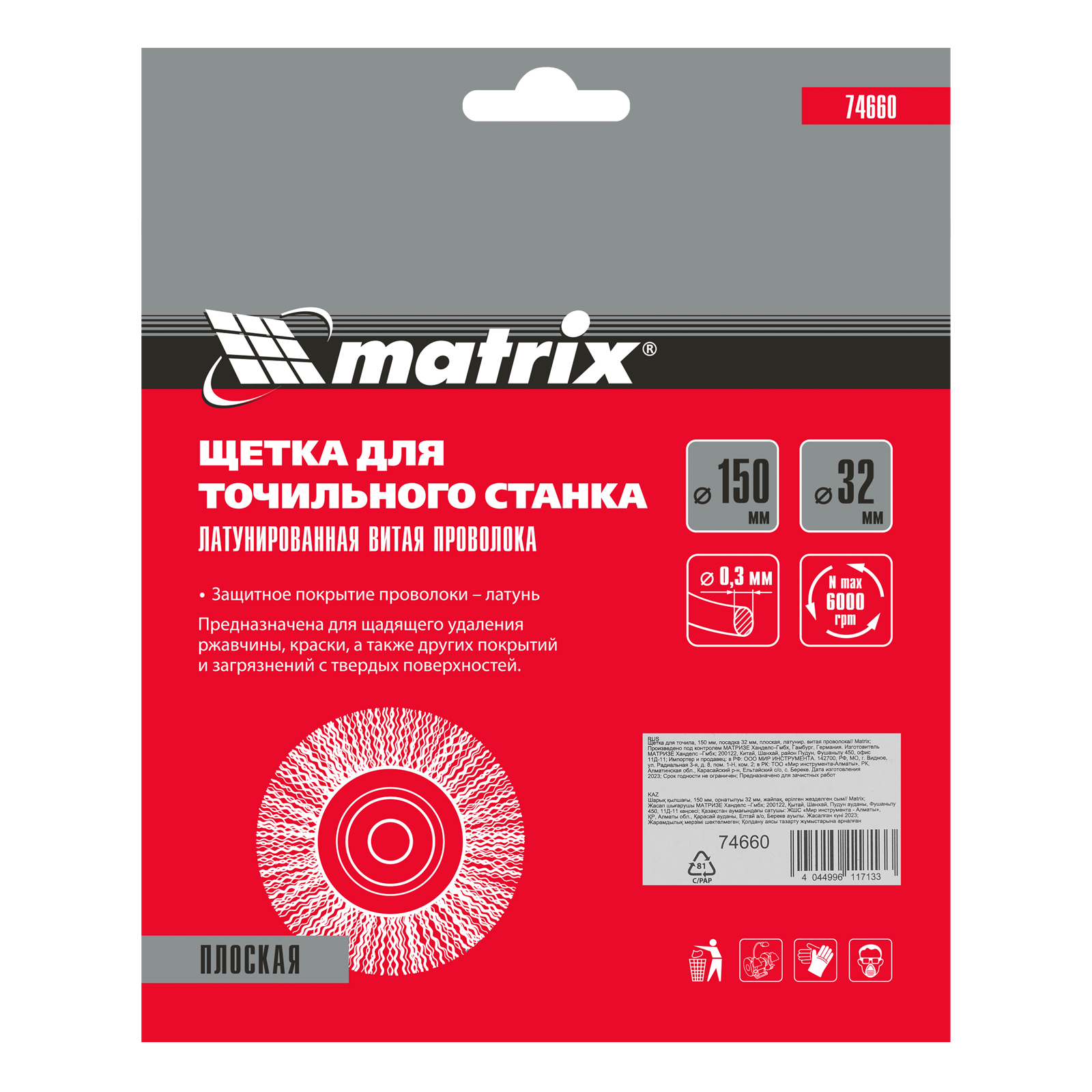 Плоская щетка Matrix 74660 диаметром 150 мм, с щетиной из латунированной витой проволоки, устанавливается на точило с посадочным размером 32 мм. Рекомендуемая скорость вращения — не более 6000 об/мин. Витая проволока позволяет в щадящем режиме зачистить тонкий слой ржавчины и лакокрасочных покрытий, удалить различные загрязнения с небольших или хрупких деталей. Благодаря плоской форме щетка подходит для обработки труднодоступных мест.