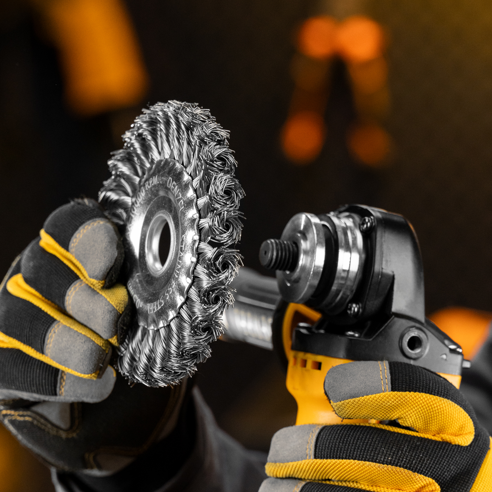 Щетка для УШМ, 125 мм, "Плоская", крученая нержавеющая проволока 0.5 мм, посадка 22.2 мм Denzel