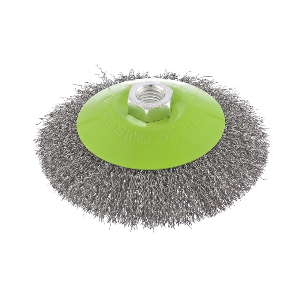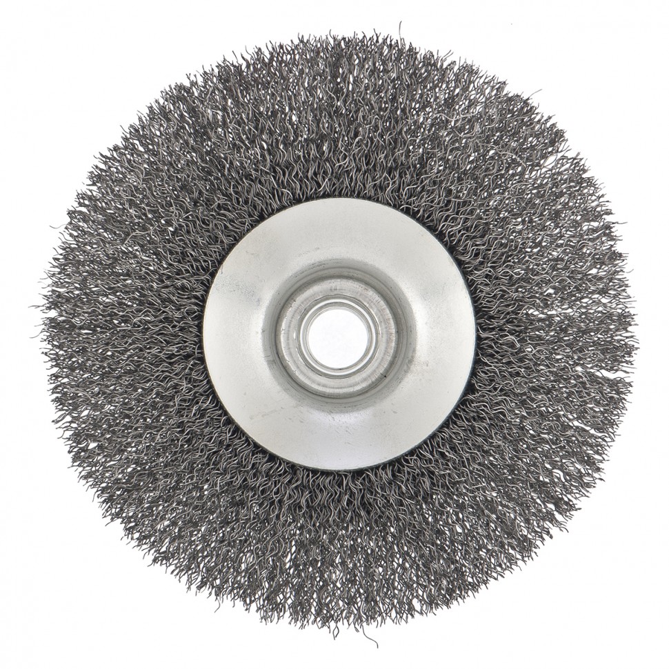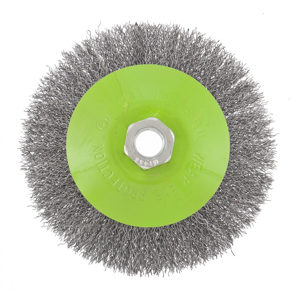 Щетка для УШМ «Тарелка» Сибртех 746167, М14, 125 мм, с щетиной из витой проволоки толщиной 0,3 мм, применяется для очистки металлических, деревянных и пластиковых поверхностей от ржавчины, старых лакокрасочных покрытий и загрязнений. Очищает как плоскости, так и труднодоступные места, поэтому оптимальна для обработки изделий сложной формы. Подходит для придания материалу шероховатости и матовости. Щетка устанавливается на вал углошлифовальной машины и выдерживает вращение со скоростью до 12500 об/мин, что обеспечивает высокую производительность оснастки. Во время работы следует использовать средства индивидуальной защиты. Щетка пригодится для проведения ремонта и решения бытовых задач.