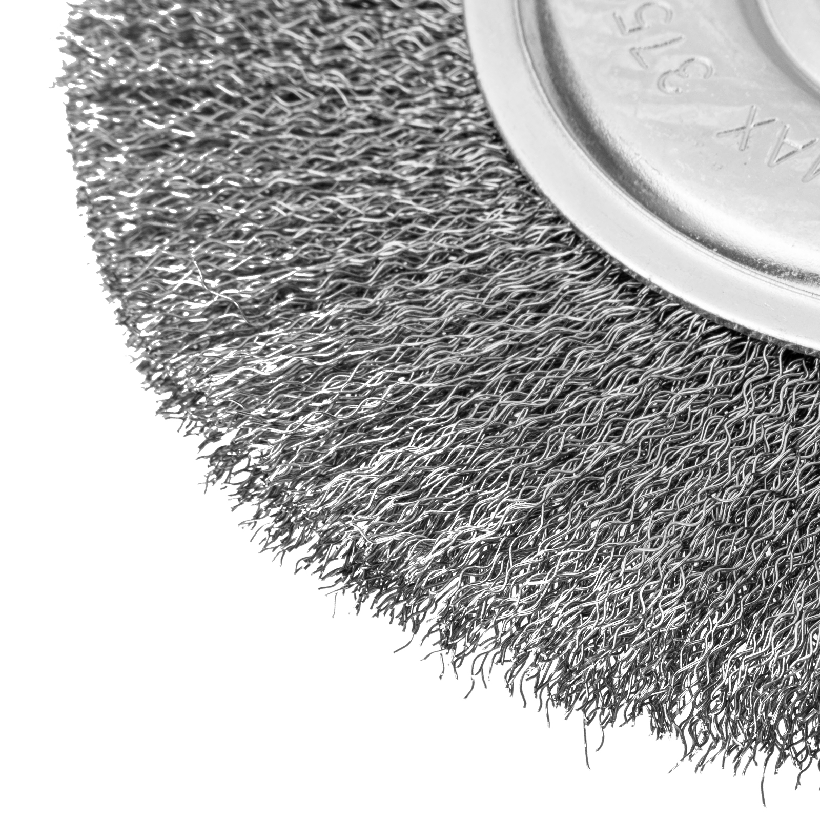 Плоская щетка для УШМ Сибртех 746687 диаметром 200 мм, с посадкой 22,2 мм, с щетиной из витой проволоки, предназначена для щадящей очистки твердых поверхностей от загрязнений, ржавчины, остатков краски и других покрытий. Щетина из проволоки толщиной 0,3 мм постепенно снимает тонкий слой материала. Плоская форма щетки делает ее оптимальным инструментом для обработки внутренних углов, пазов, изгибов и малодоступных мест. Щетка позволяет придать шероховатость или подчеркнуть структуру материала. Насадка устанавливается на фланец углошлифовальной машины и подходит для продолжительной работы, не требующей частой смены оснасток. Рекомендуемая максимальная скорость вращения составляет 3750 об/мин. Для обеспечения безопасности оператора следует использовать средства индивидуальной защиты. Щетка применяется в строительной, производственной сфере, а также в быту.