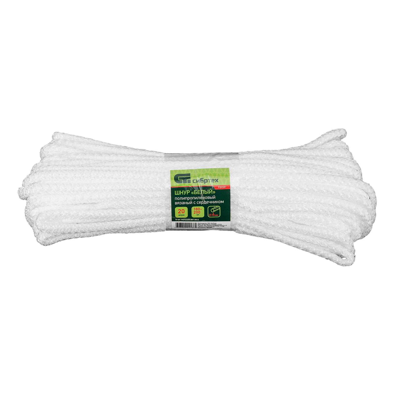 Вязаный полипропиленовый шнур с сердечником Сибртех 93959 белого цвета, диаметром 6 мм, длиной 20 м, будет полезен для хозяйственных нужд: сушки белья, связывания предметов, подвязки растений. Пригодится также в походе, на охоте или рыбалке. Благодаря сердечнику и высокопрочной оплетке обладает повышенной устойчивостью к истиранию и разрыву — максимальная разрывная нагрузка составляет 95 кгс. Шнур выдерживает значительный вес, не растягивается и не провисает.