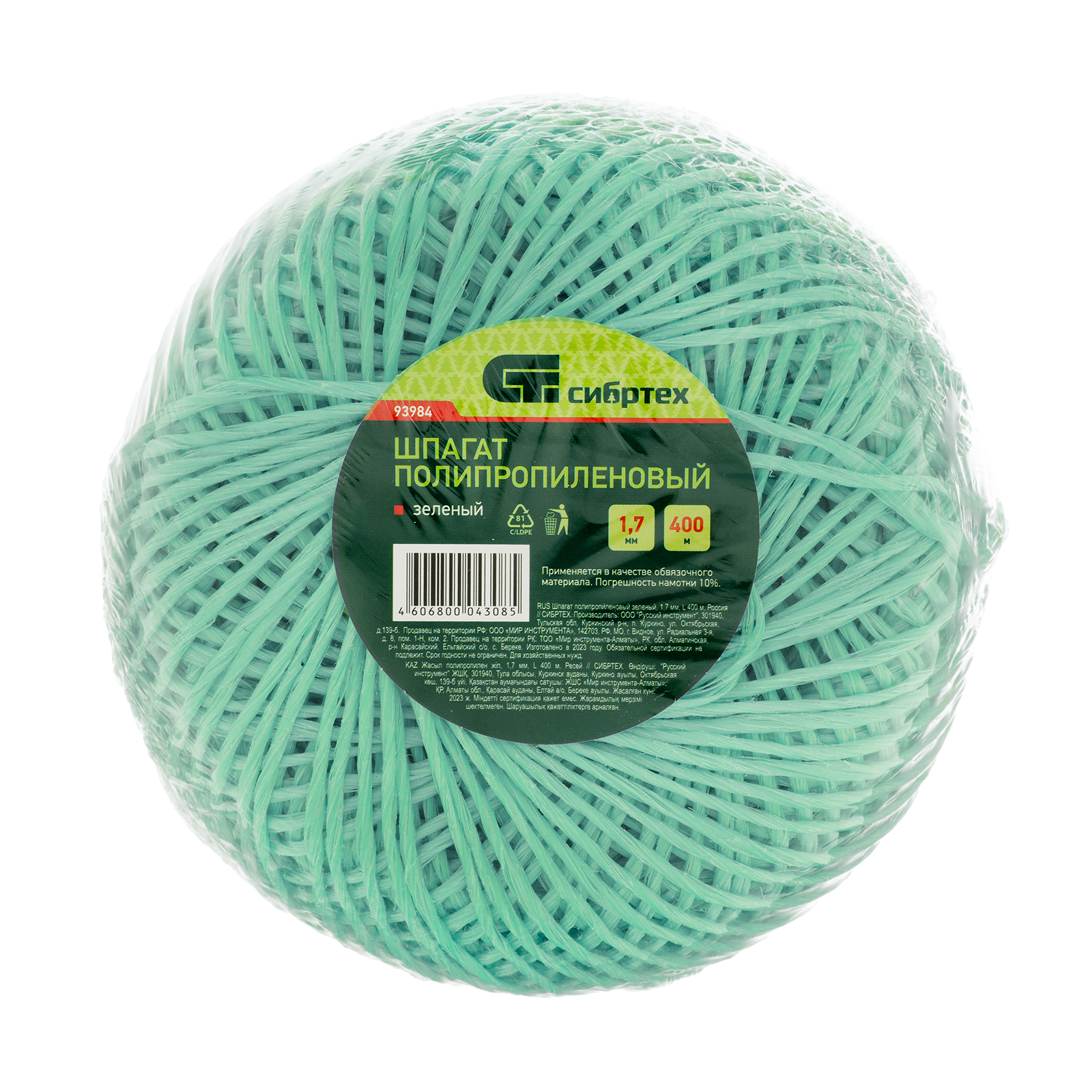 Шпагат полипропиленовый зеленый, 1.7 мм, L 400 м, Сибртех в Москве