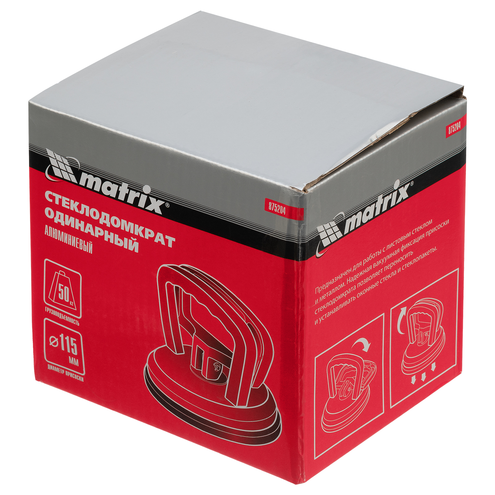 Алюминиевый одинарный стеклодомкрат Matrix 875204 позволяет поднимать, переносить и устанавливать стекла, зеркала, плитку, листовой металл и другие гладкие материалы. Двойная рукоятка складывается и надежно фиксирует присоску на поверхности, не повреждая ее. Стеклодомкрат позволяет длительное время удерживать груз весом до 50 кг. Будет полезен во время строительства, ремонта, а также пригодится в быту.