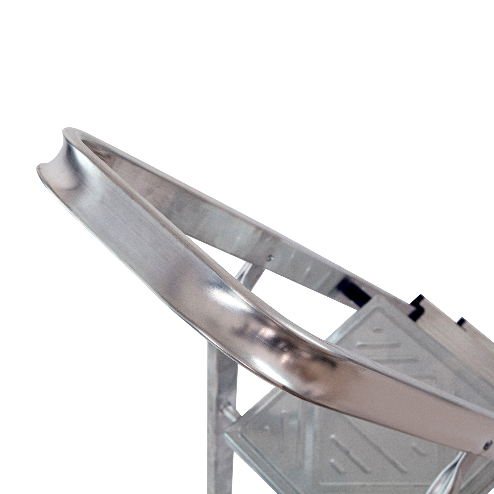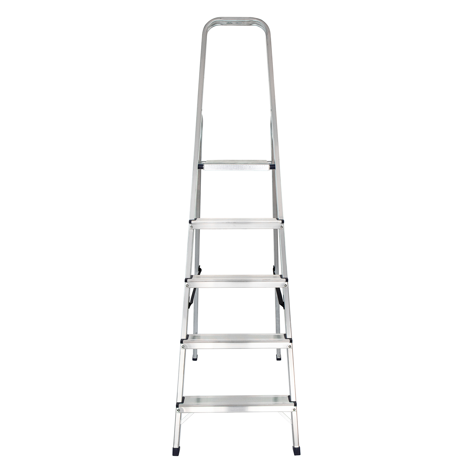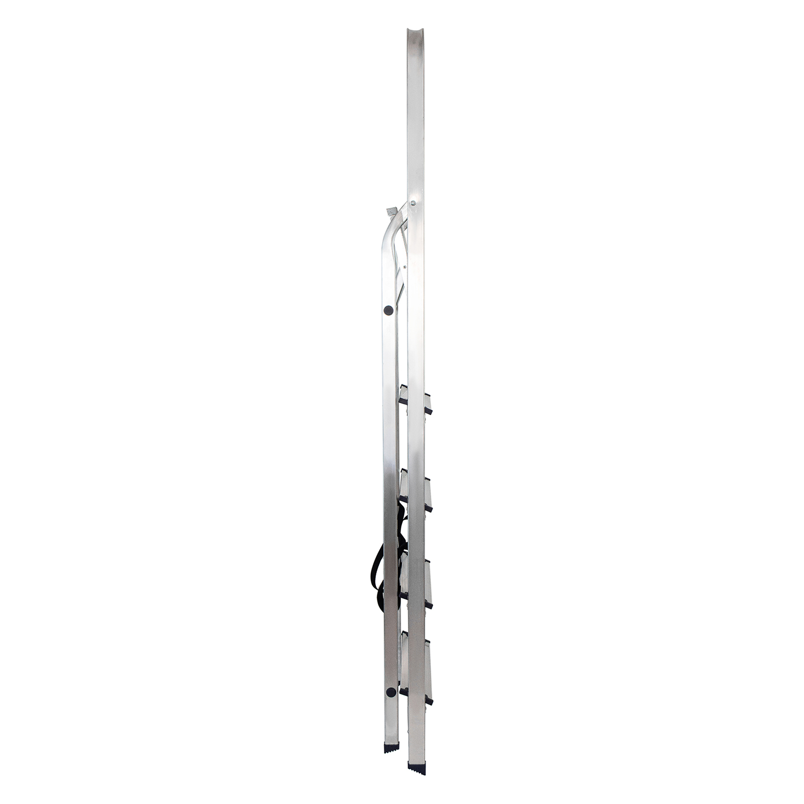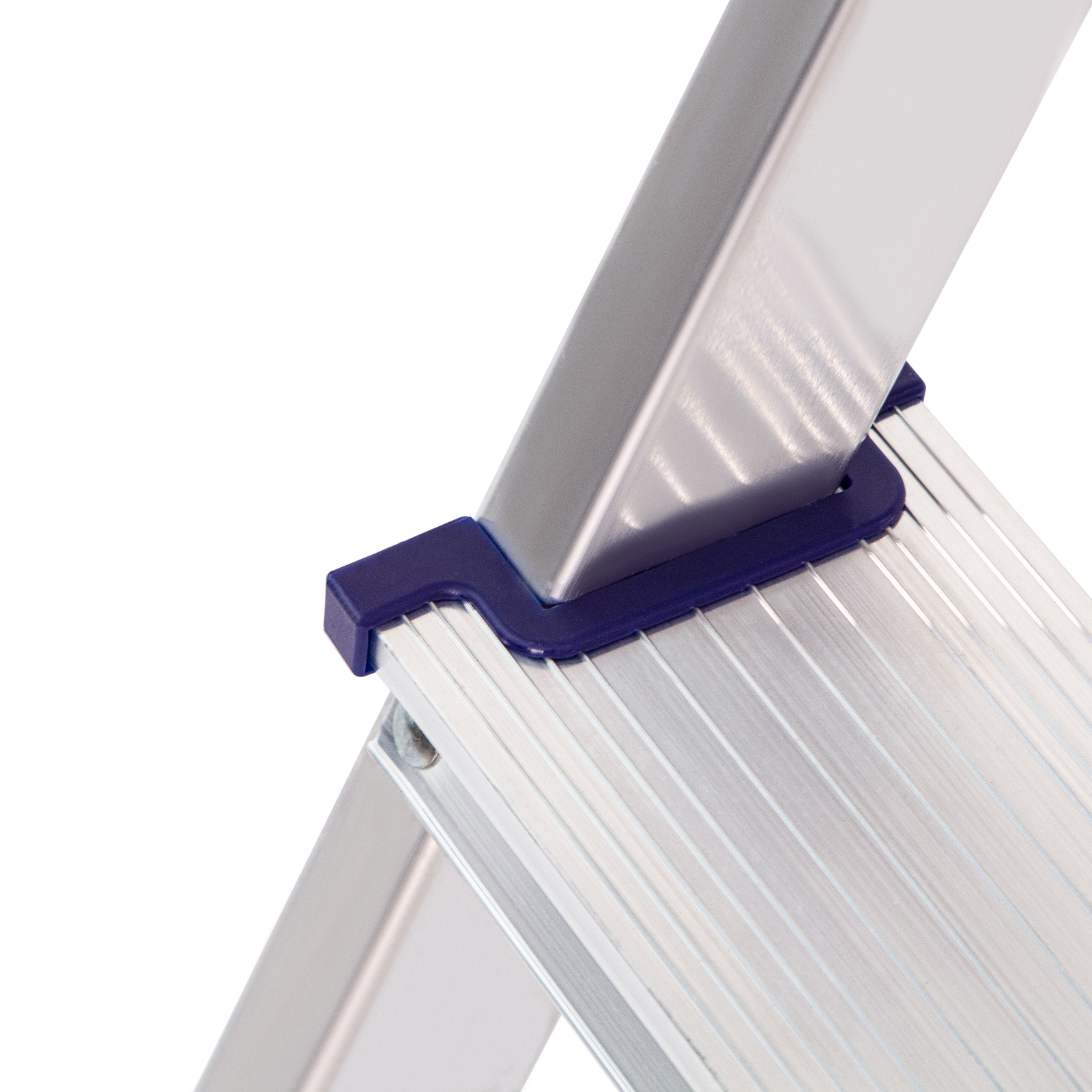 • Надежность — рама из прямоугольного алюминиевого профиля выдерживает нагрузку до 150 кг, широкие ступени закреплены заклепками, страховочные стяжки повышают прочность конструкции.