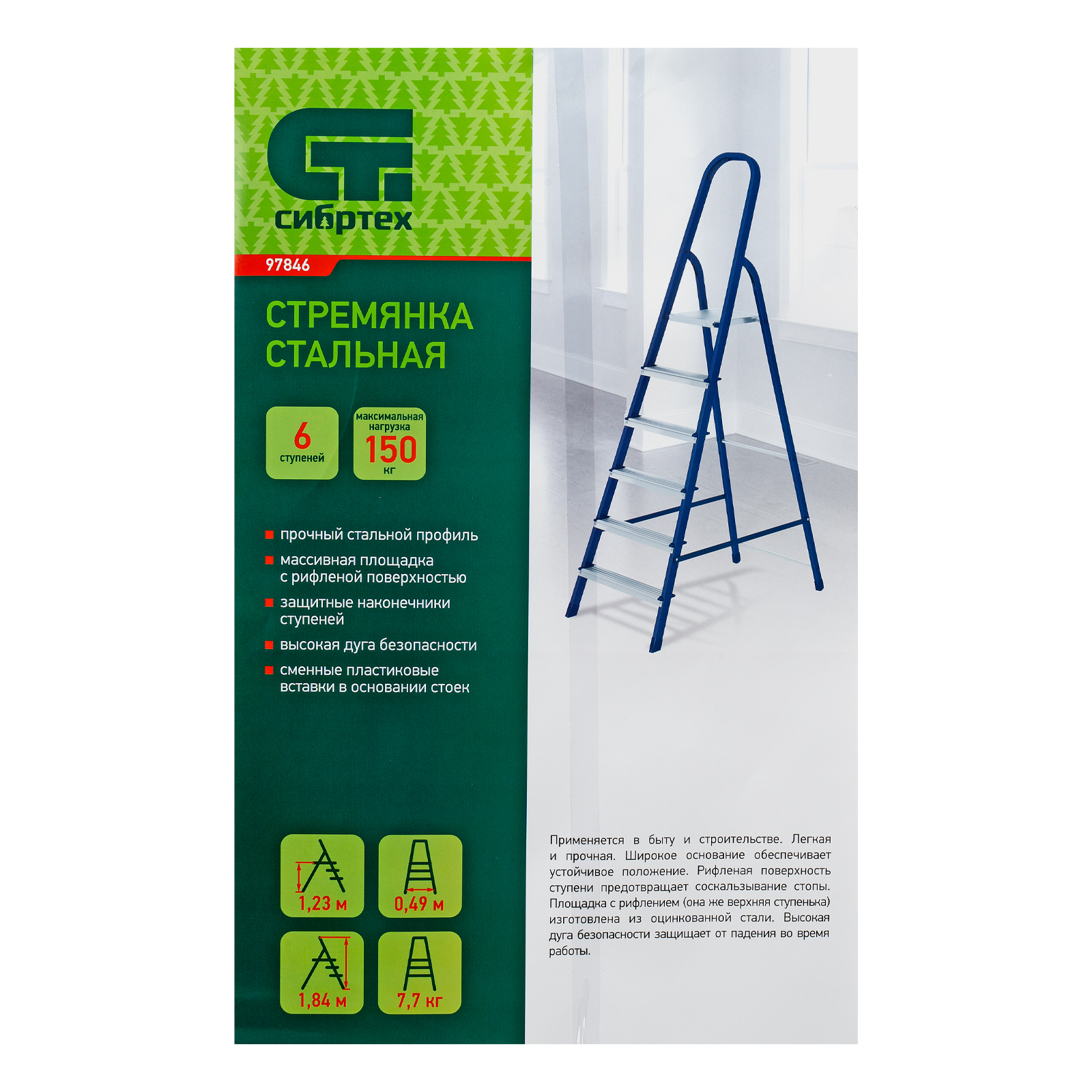 Стремянка стальная Сибртех 97846 с 6 ступенями облегчает выполнение ремонтных, отделочных, а также различных бытовых работ на высоте, превышающей человеческий рост. Площадка находится на высоте 122 см от опорной поверхности, рабочая высота стремянки составляет 322 см (при среднем росте пользователя 170 см). Высокая дуга безопасности обеспечивает удобную эксплуатацию. Стремянка пригодится дома и на даче.