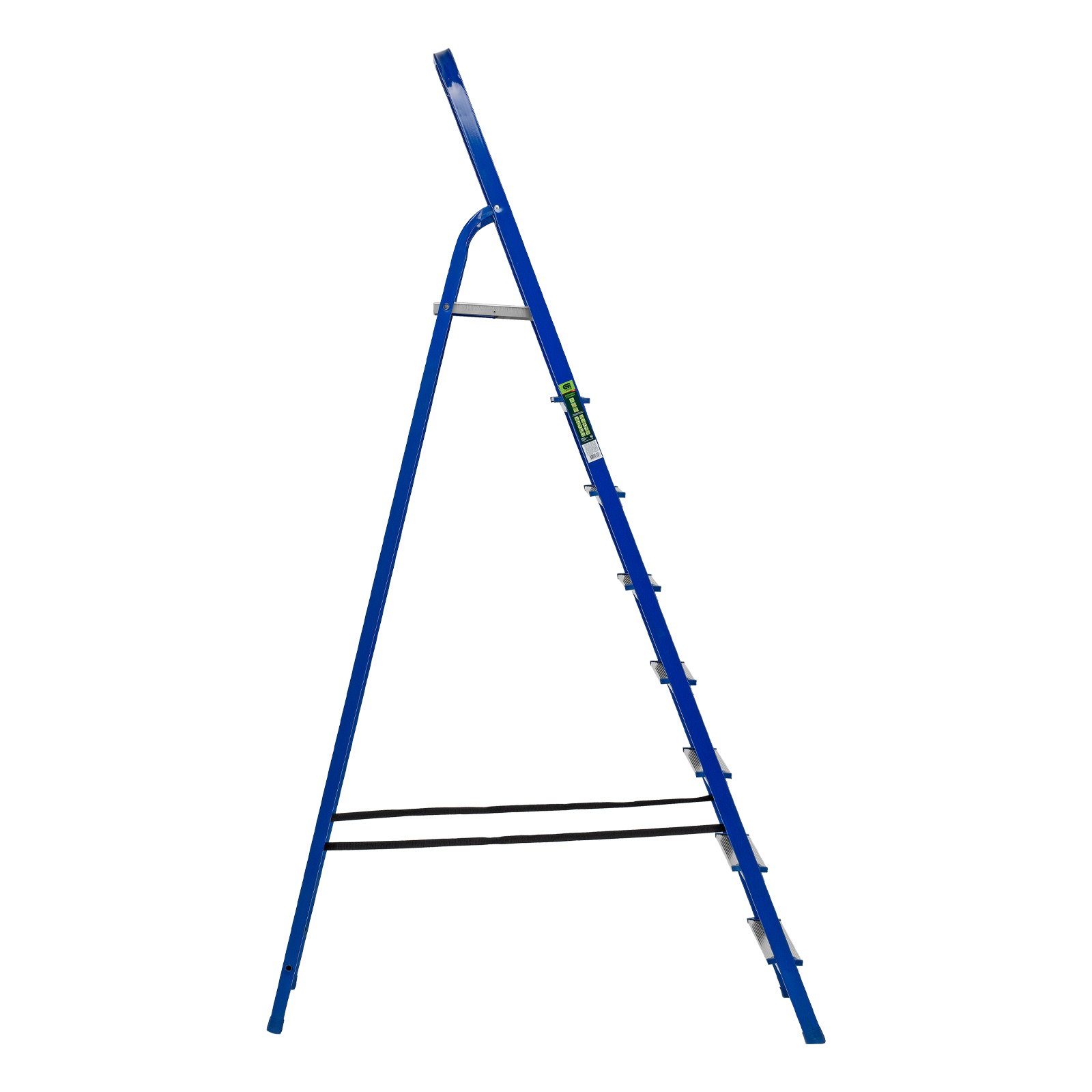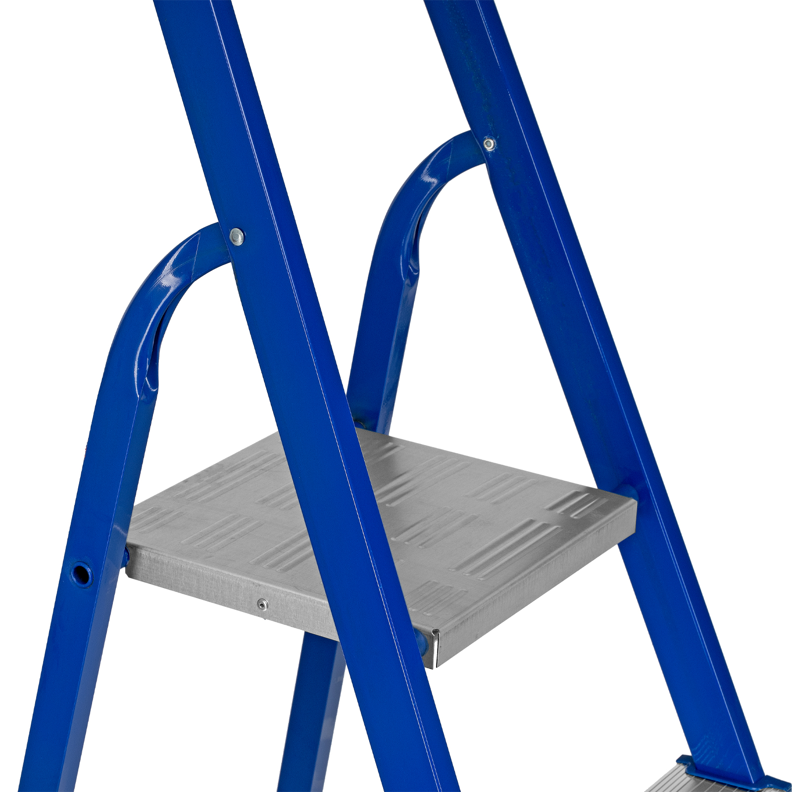 Стремянка Сибртех 97958 со стальным профилем и 8 ступенями, 7 из которых алюминиевые, упрощает доступ к предметам, расположенным на антресолях, шкафах, высоких полках. Также будет полезна для проведения отделочных и монтажных работ. Лестница обладает высокой прочностью при весе 8,5 кг и выдерживает нагрузку до 150 кг. Площадка находится на высоте 166,6 см от опорной поверхности, рабочая высота стремянки составляет 366,6 см (при среднем росте пользователя 170 см).