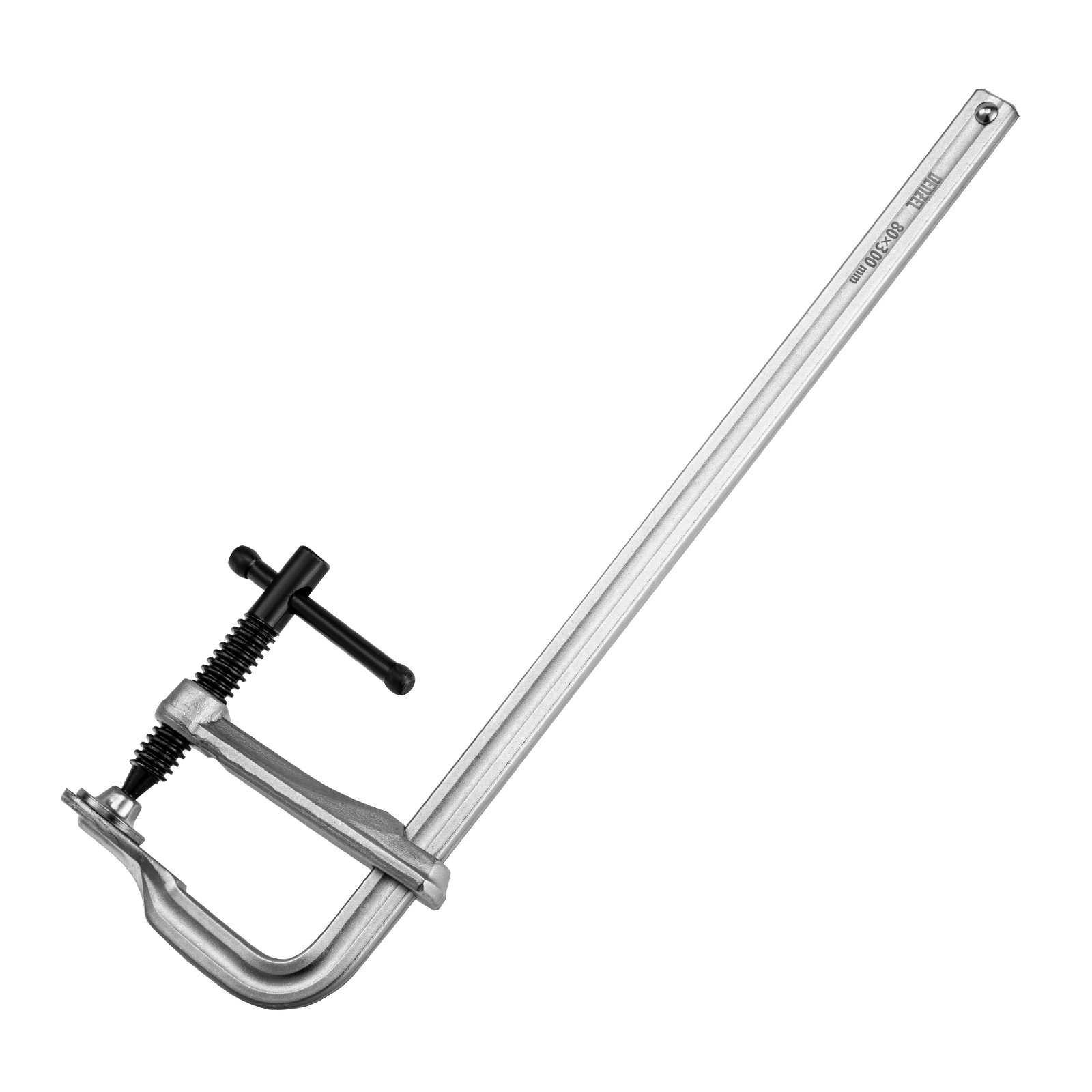 Кованая F-образная струбцина Denzel 20466 с глубиной зажима 80 мм, усиленная, предназначена для фиксации деталей шириной до 300 мм и материалов при проведении слесарных, столярных и сварочных работ. Тавровый профиль обеспечивает устойчивость конструкции к изгибу, что позволяет фиксировать детали со значительным усилием. Струбцина подходит для профессионального применения.