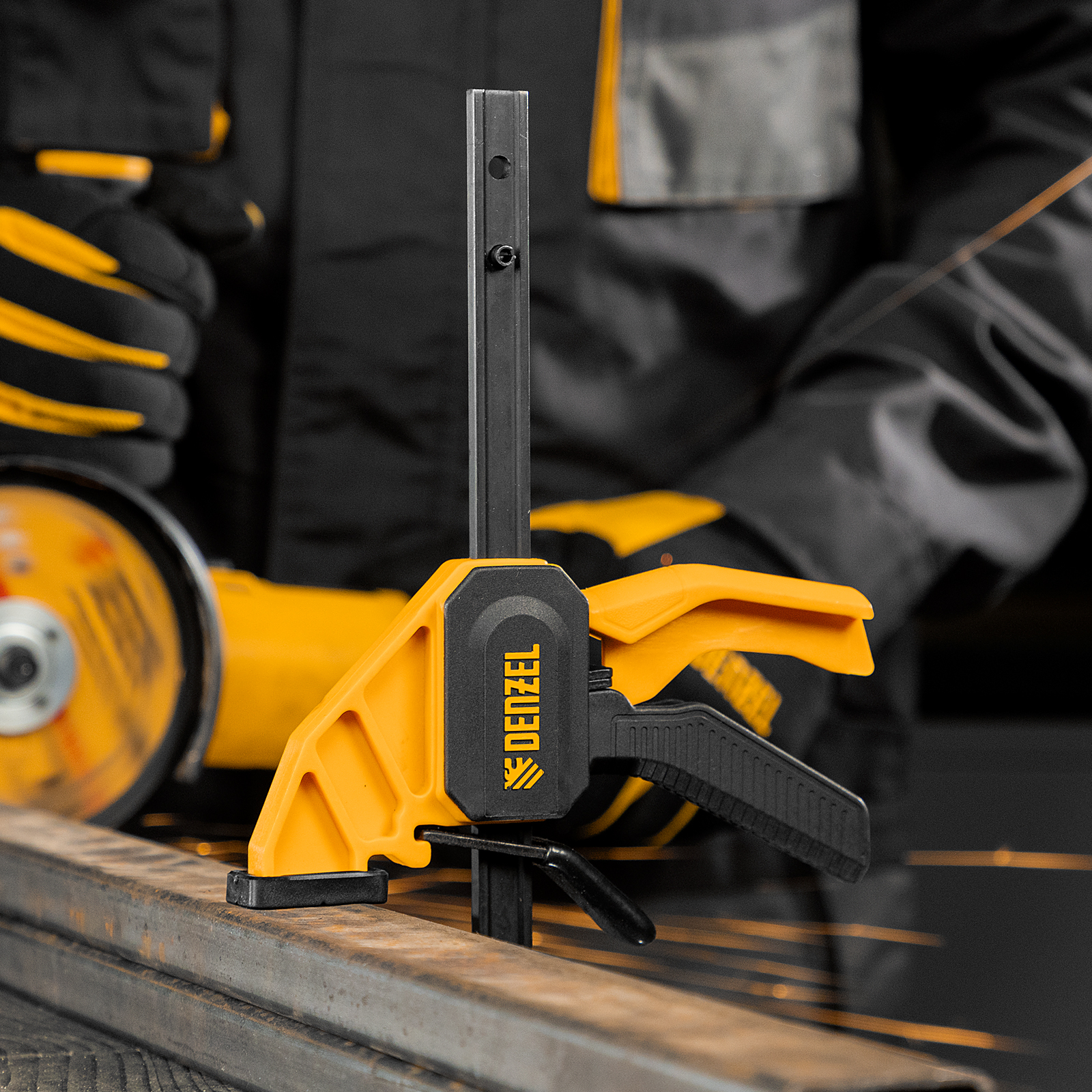 - Комфортное использование — струбцина весит всего 290 г, обрезиненная кнопка фиксации обеспечивает удобный захват.