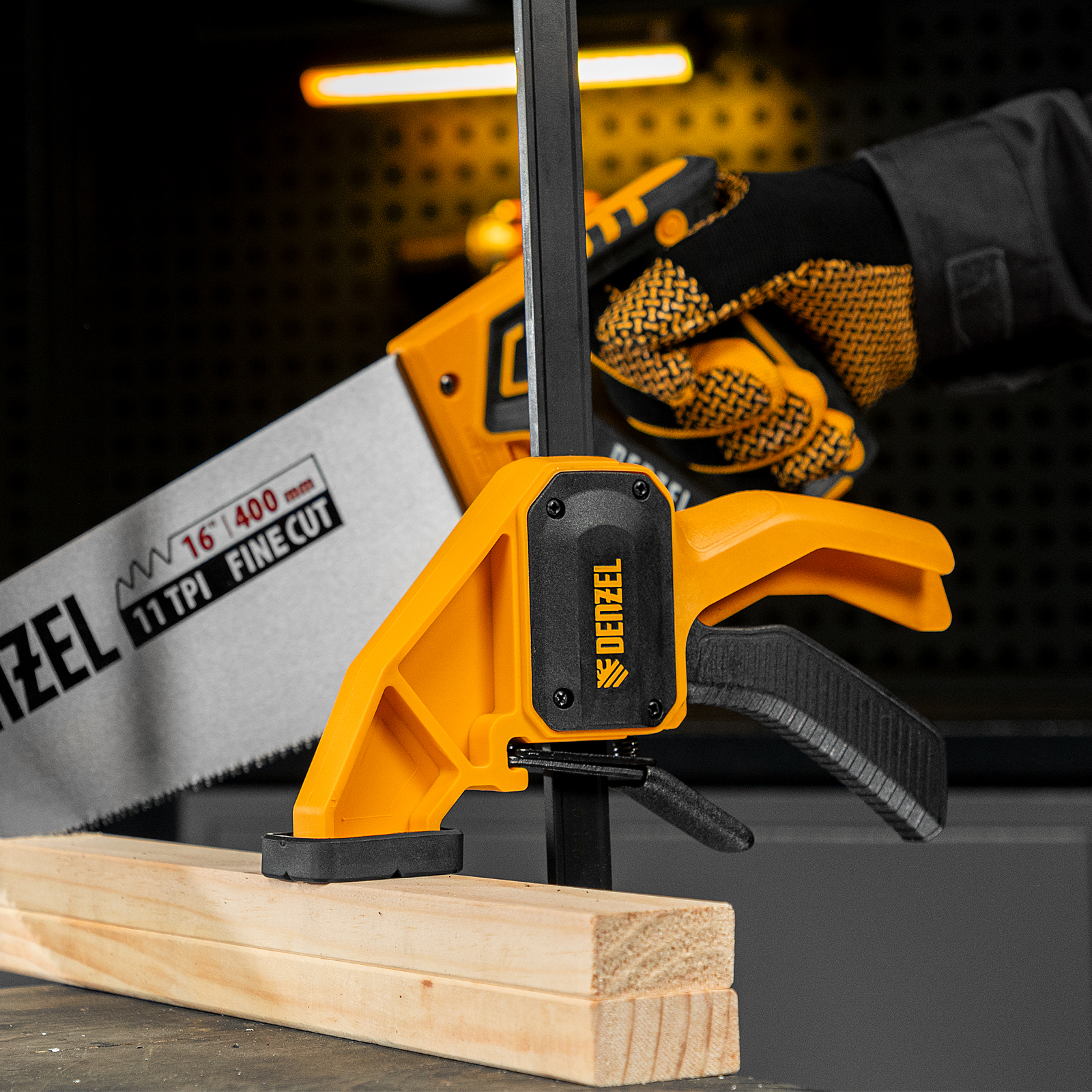 - Комфортное использование — струбцина весит всего 620 г, обрезиненная кнопка фиксации обеспечивает удобный захват.