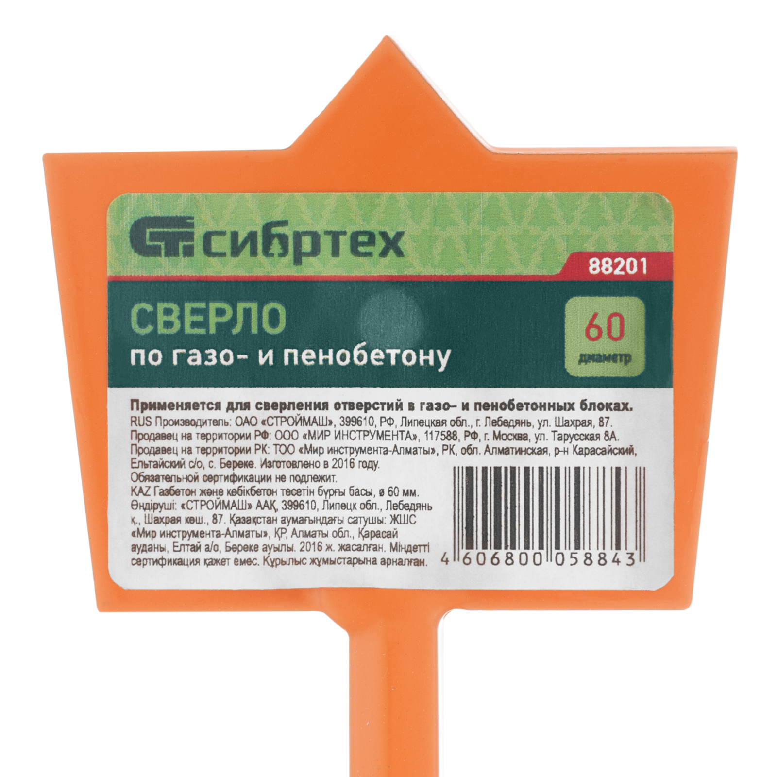 Сверло Сибртех 88201 диаметром 60 мм используется для получения отверстий в газо- и пенобетоне. Оснастка рассчитана на бытовое использование и подходит для выполнения небольшого объема работ.