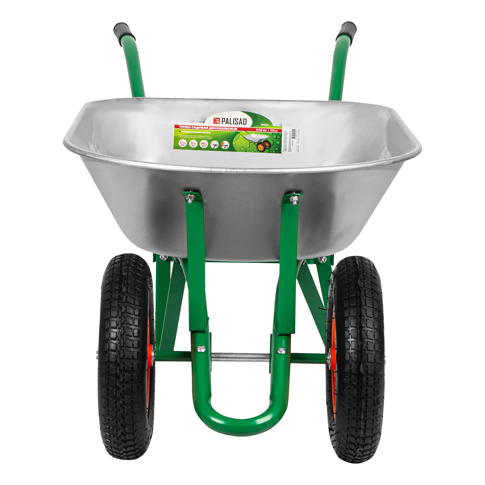 Садовая тачка Palisad 689225 с двумя колесами, грузоподъемностью 170 кг и с кузовом объемом 78 л, рассчитана на транспортировку садовых и легких строительных грузов. Избавляет от необходимости ручного перемещения тяжестей и позволяет снизить нагрузку на спину.