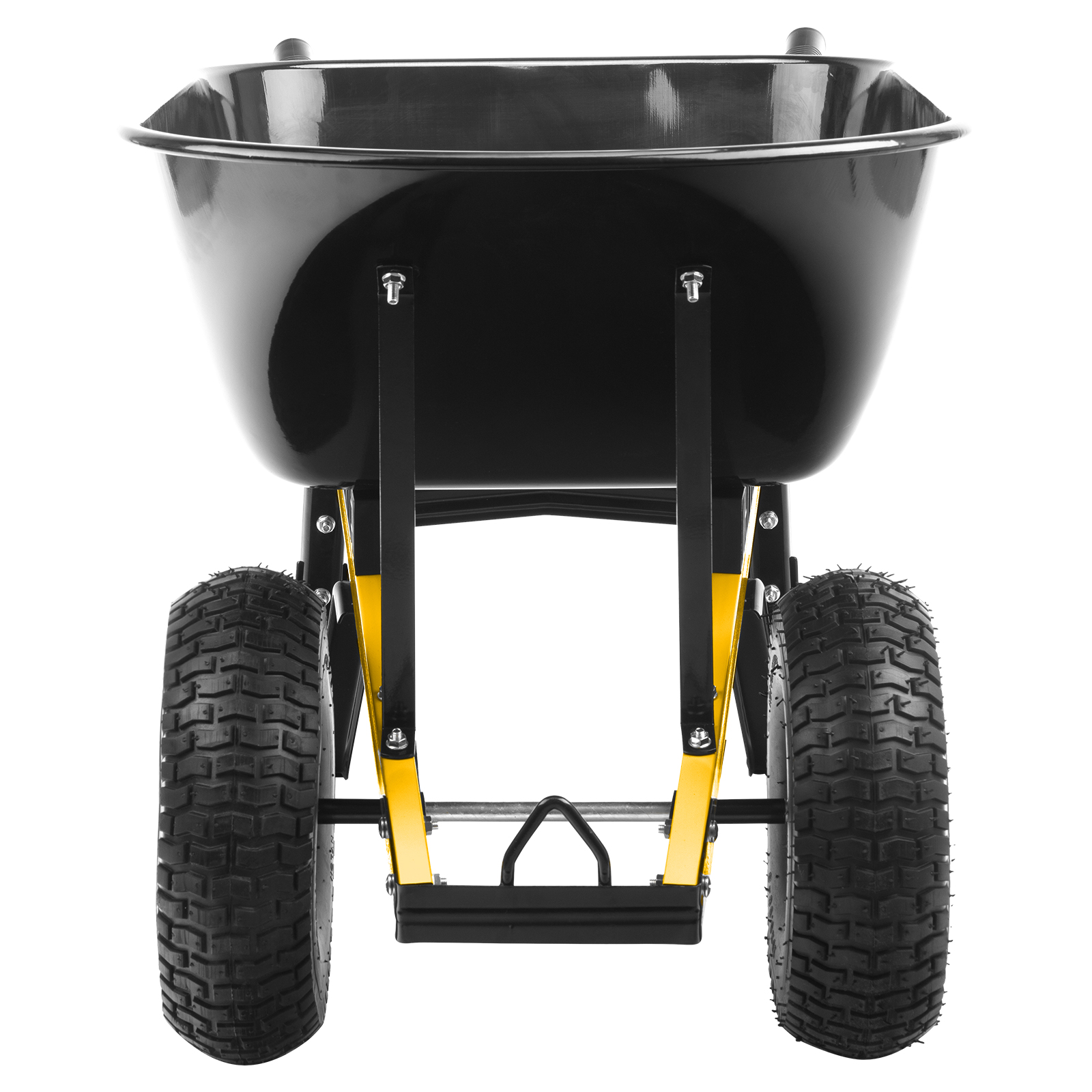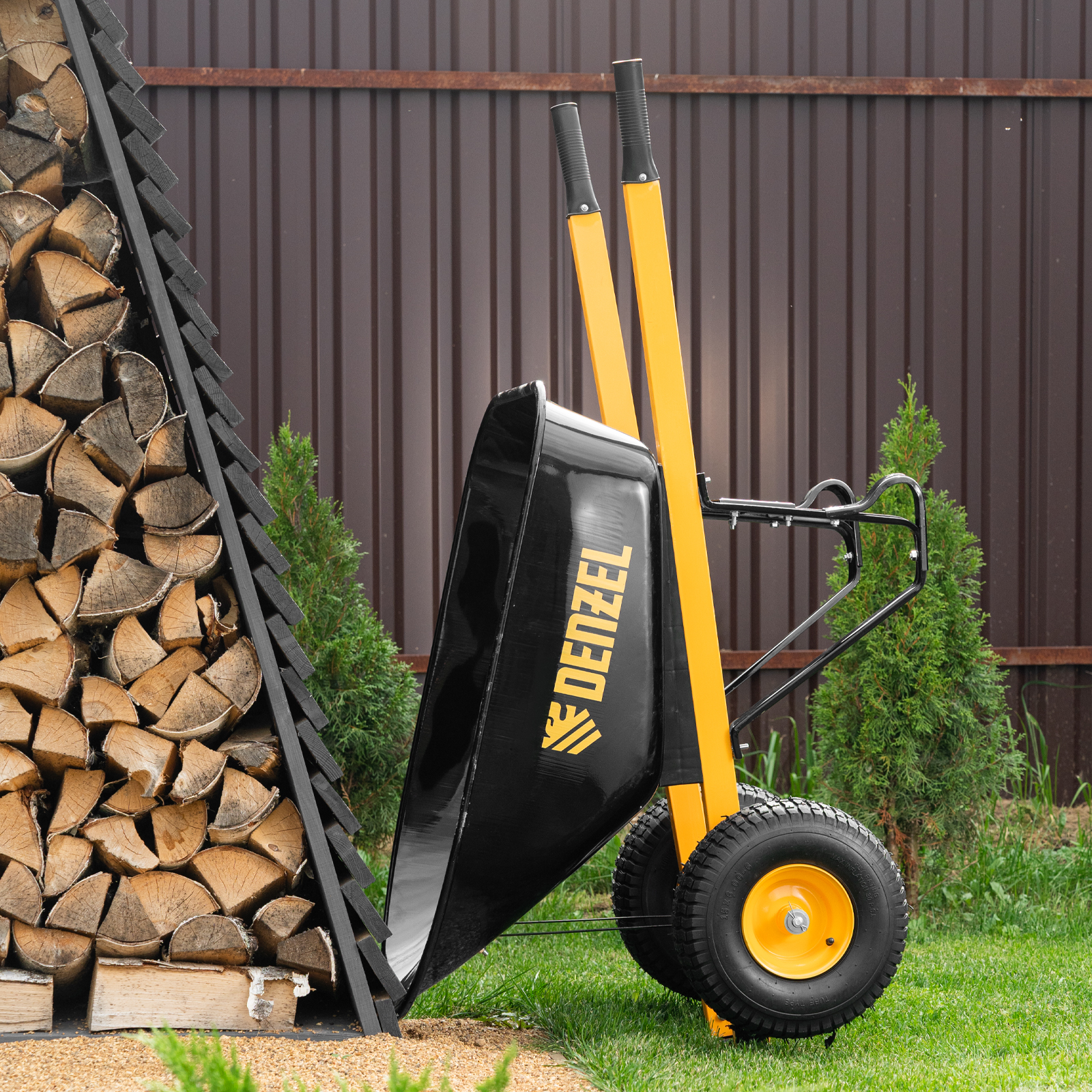 - Устойчивость — широкие пневматические колеса с грунтозацепом и мощная рама с подпятниками предотвращают проваливание тачки в грунт.