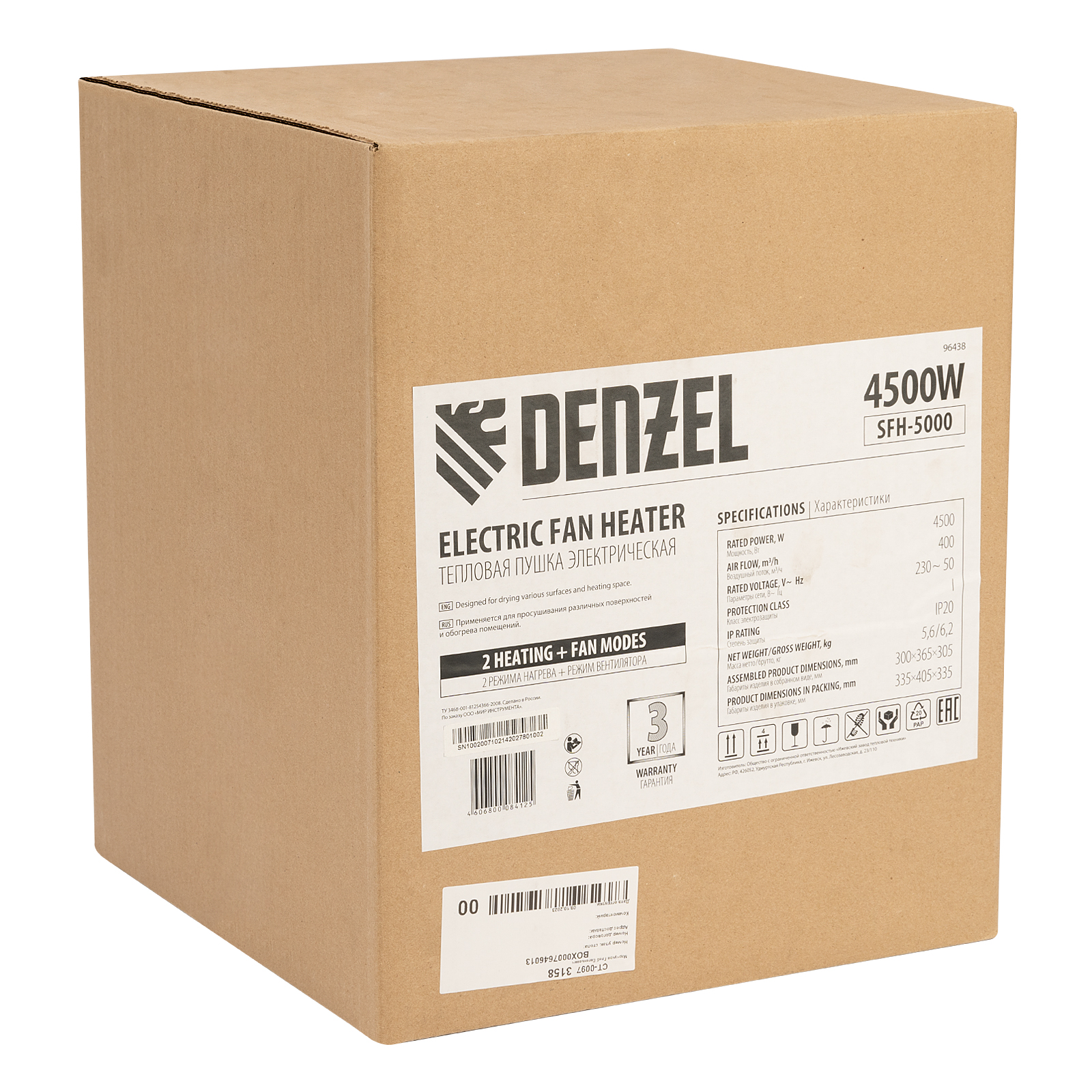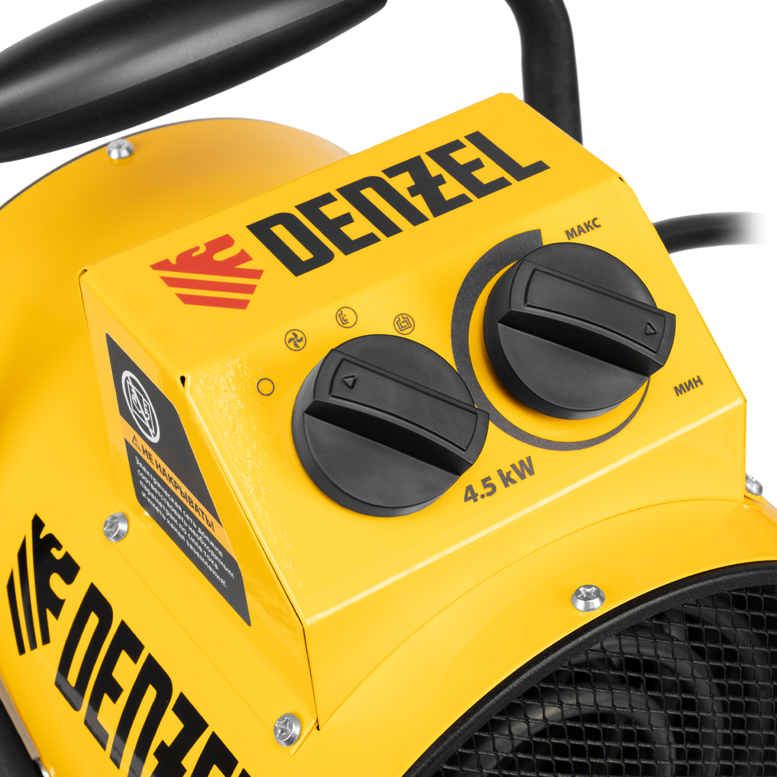 Тепловая пушка профессиональной серии Denzel SFH-5000 96438 питается от сети 230 В и генерирует воздушный поток мощностью 260 м³/ч. Работает в одном из 3 режимов: вентилятор, обогрев на мощности 2250 и обогрев на мощности 4500 Вт. Используется в складских, производственных, общественных помещениях площадью до 45 м². Подходит для дистанционной просушки поверхностей, например, окрашенных или оштукатуренных стен во время отделочных работ.