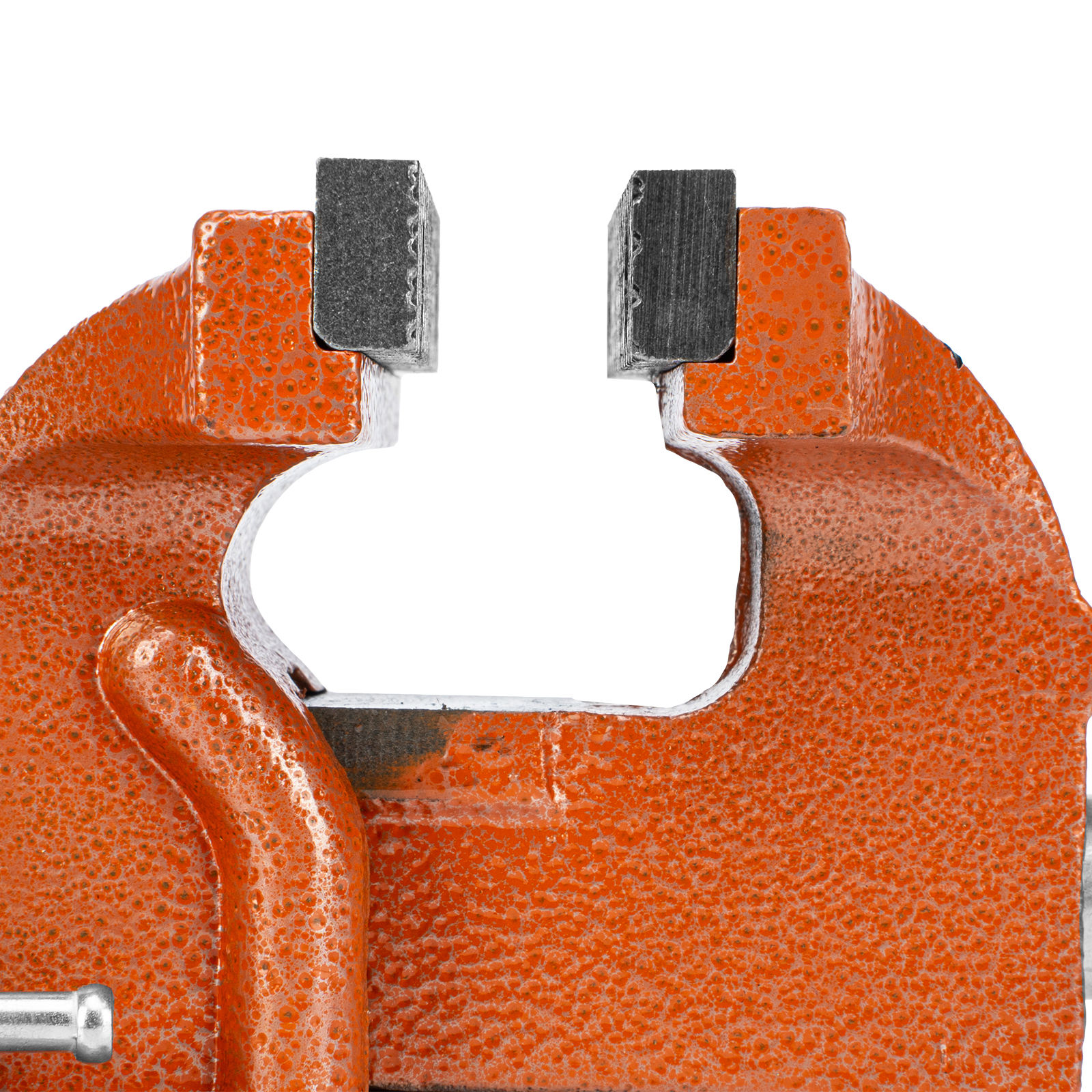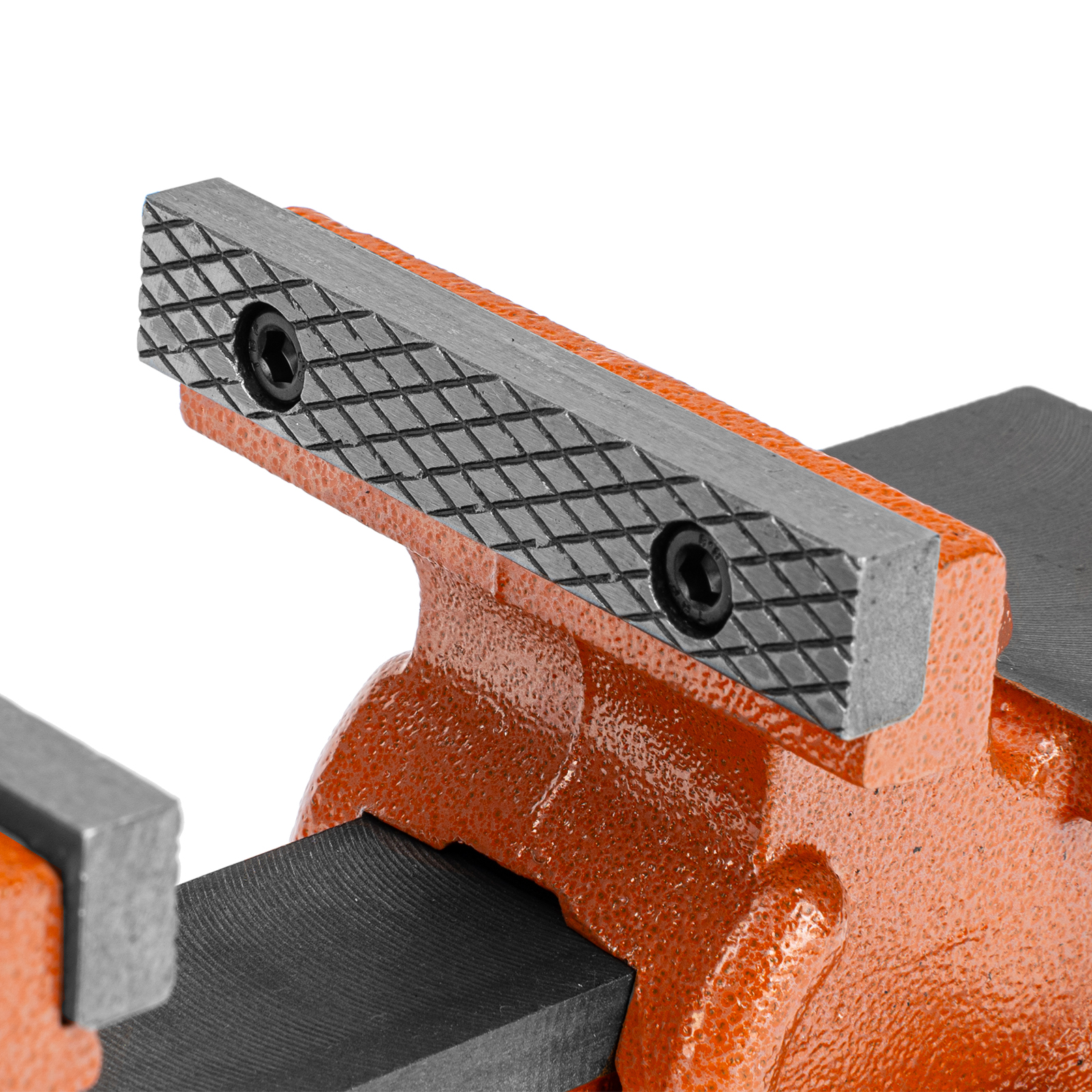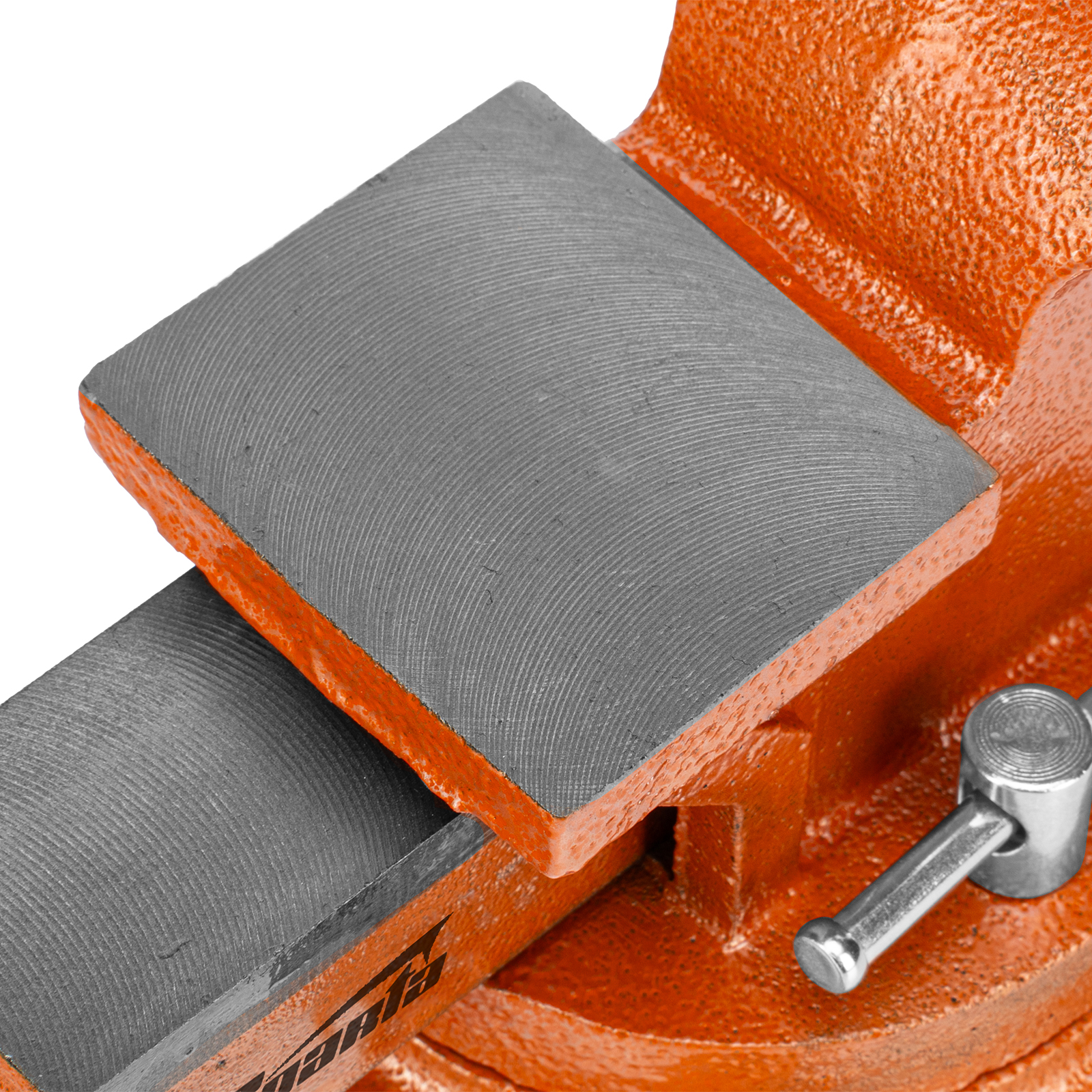 - Корпус тисков выполнен из чугуна, а губки — из стали, благодаря чему достигается высокая прочность инструмента.