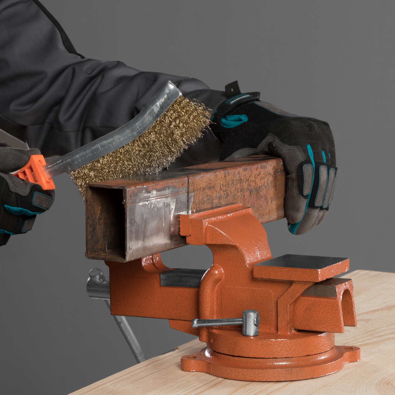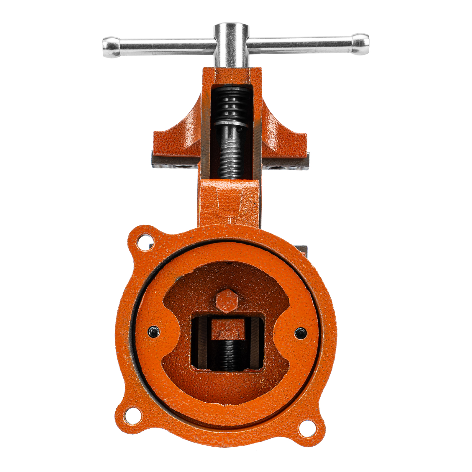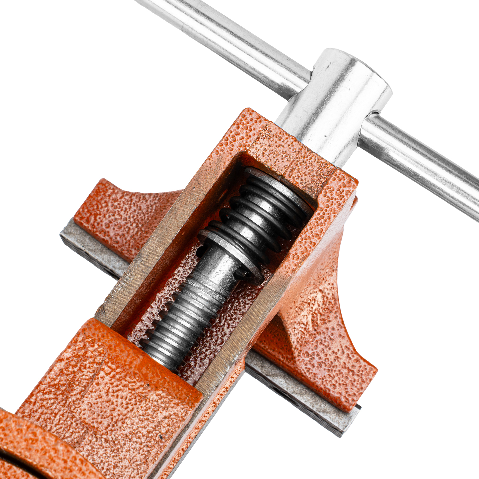 - Корпус тисков выполнен из чугуна, а губки — из стали, благодаря чему достигается высокая прочность инструмента.