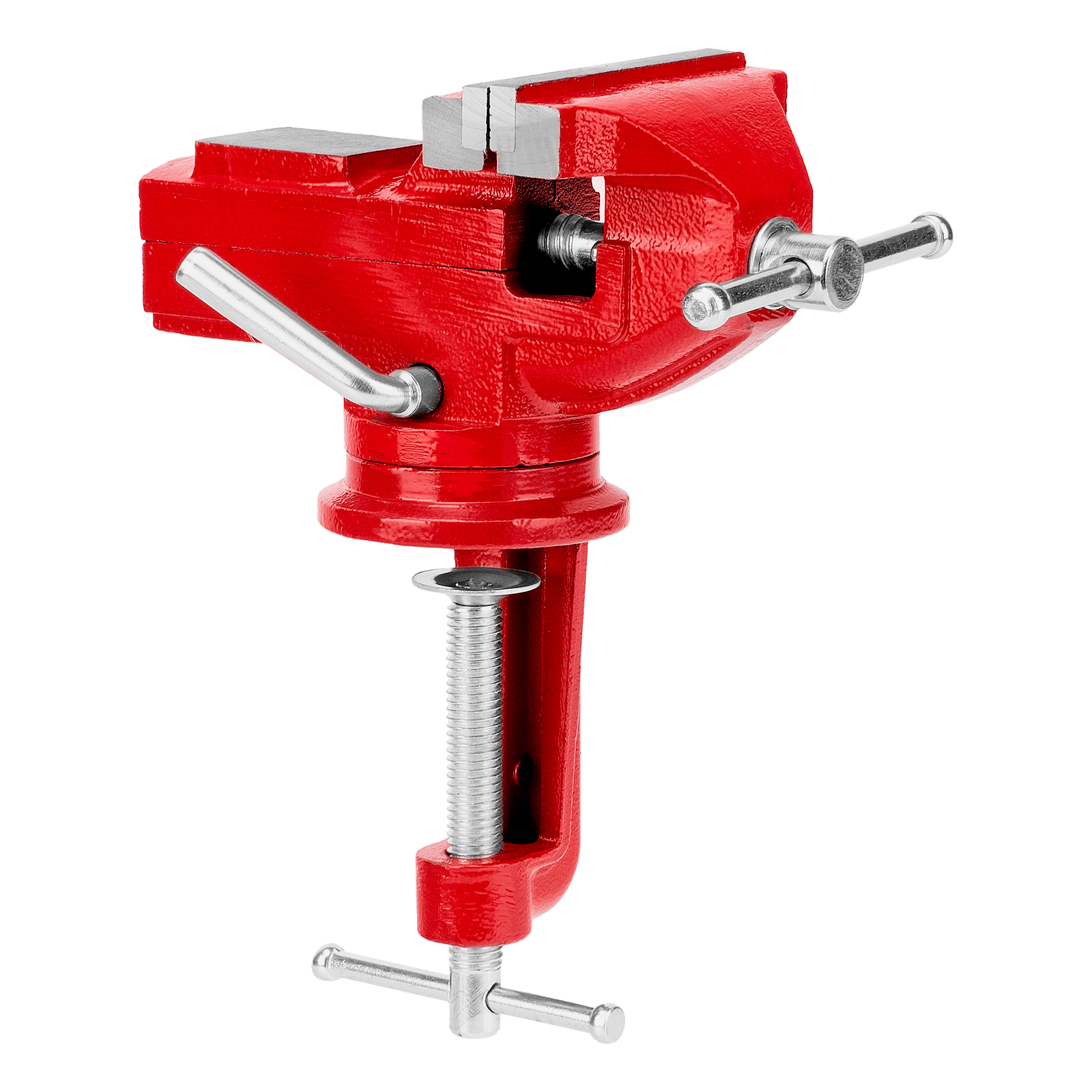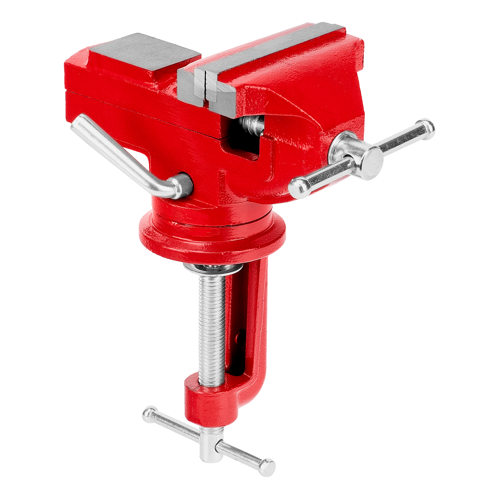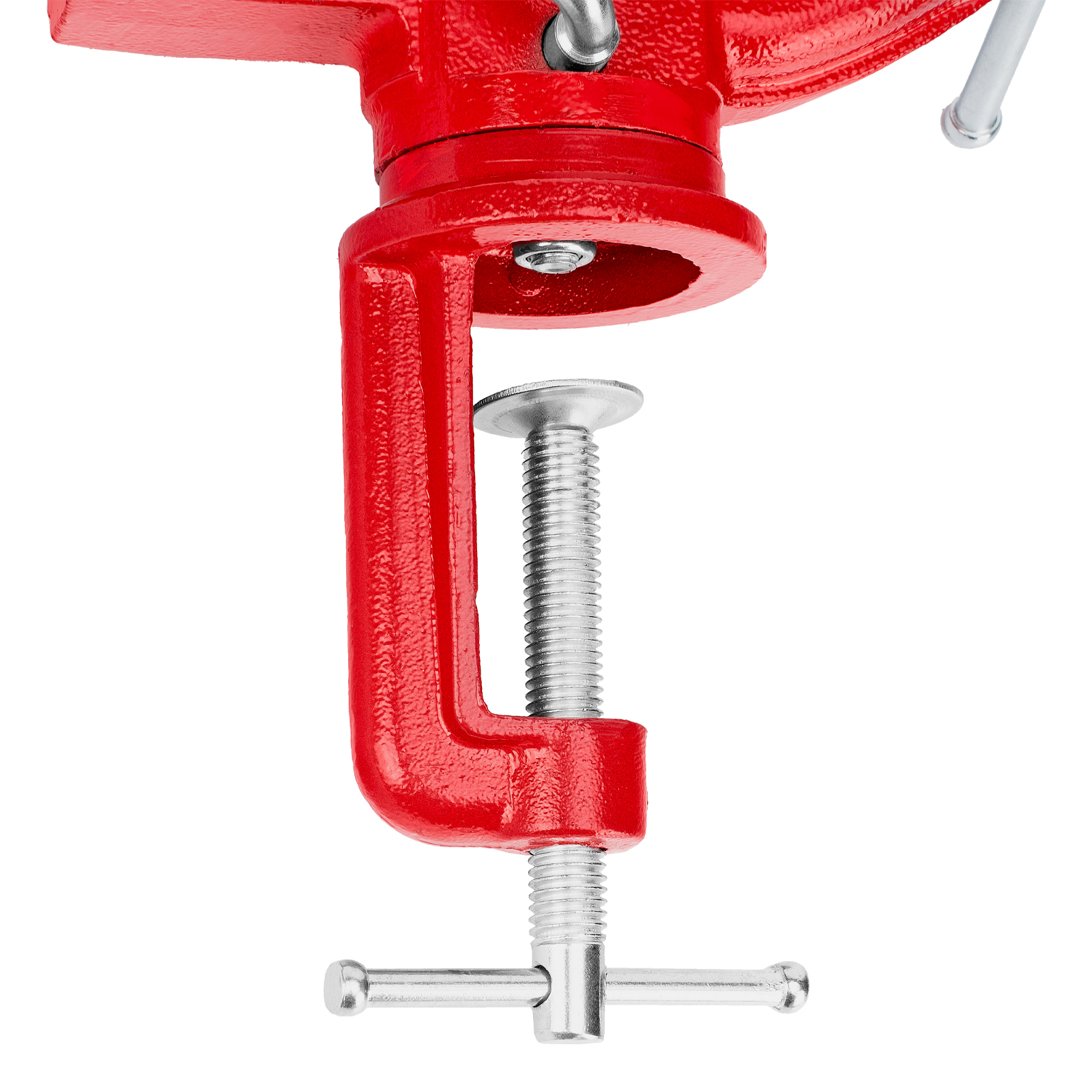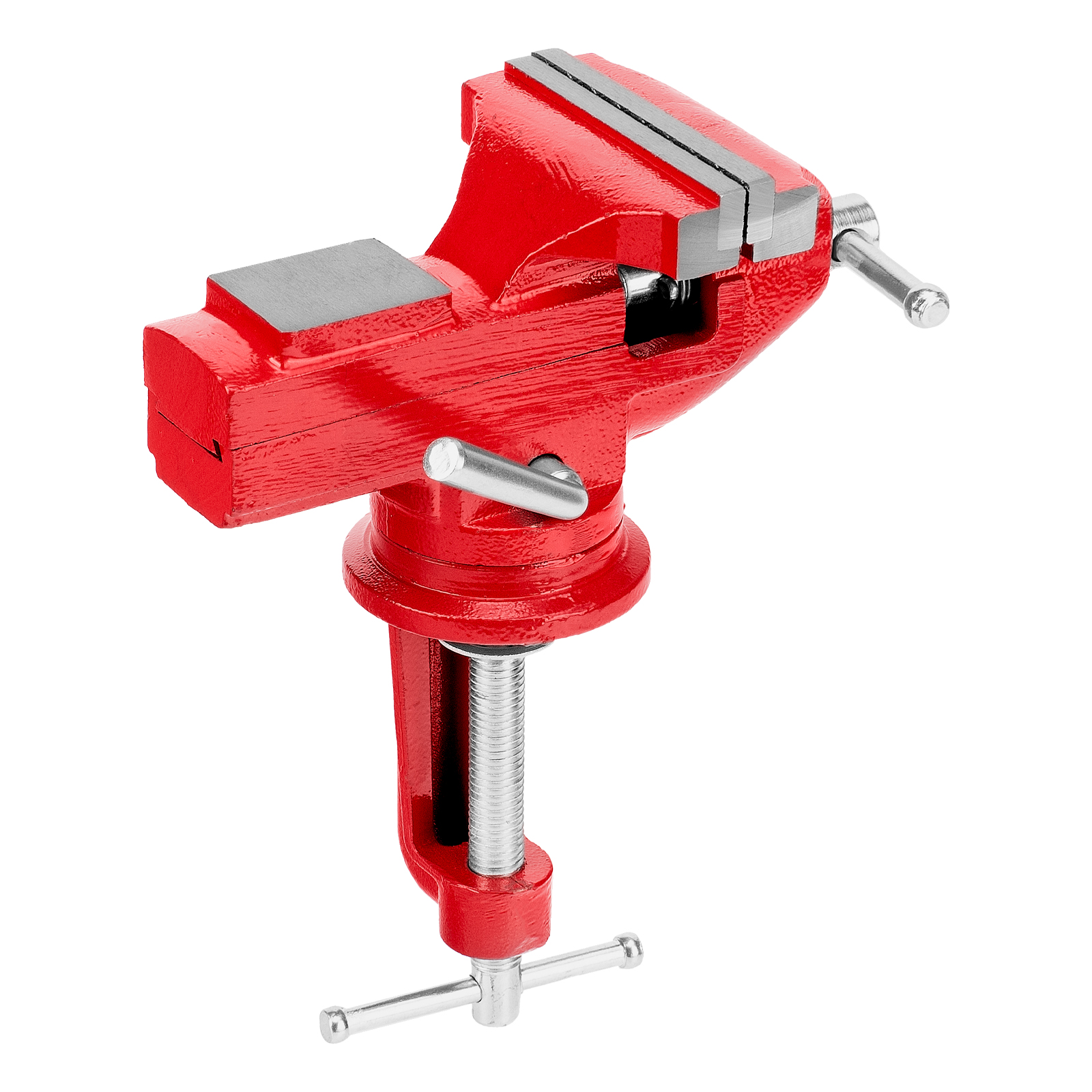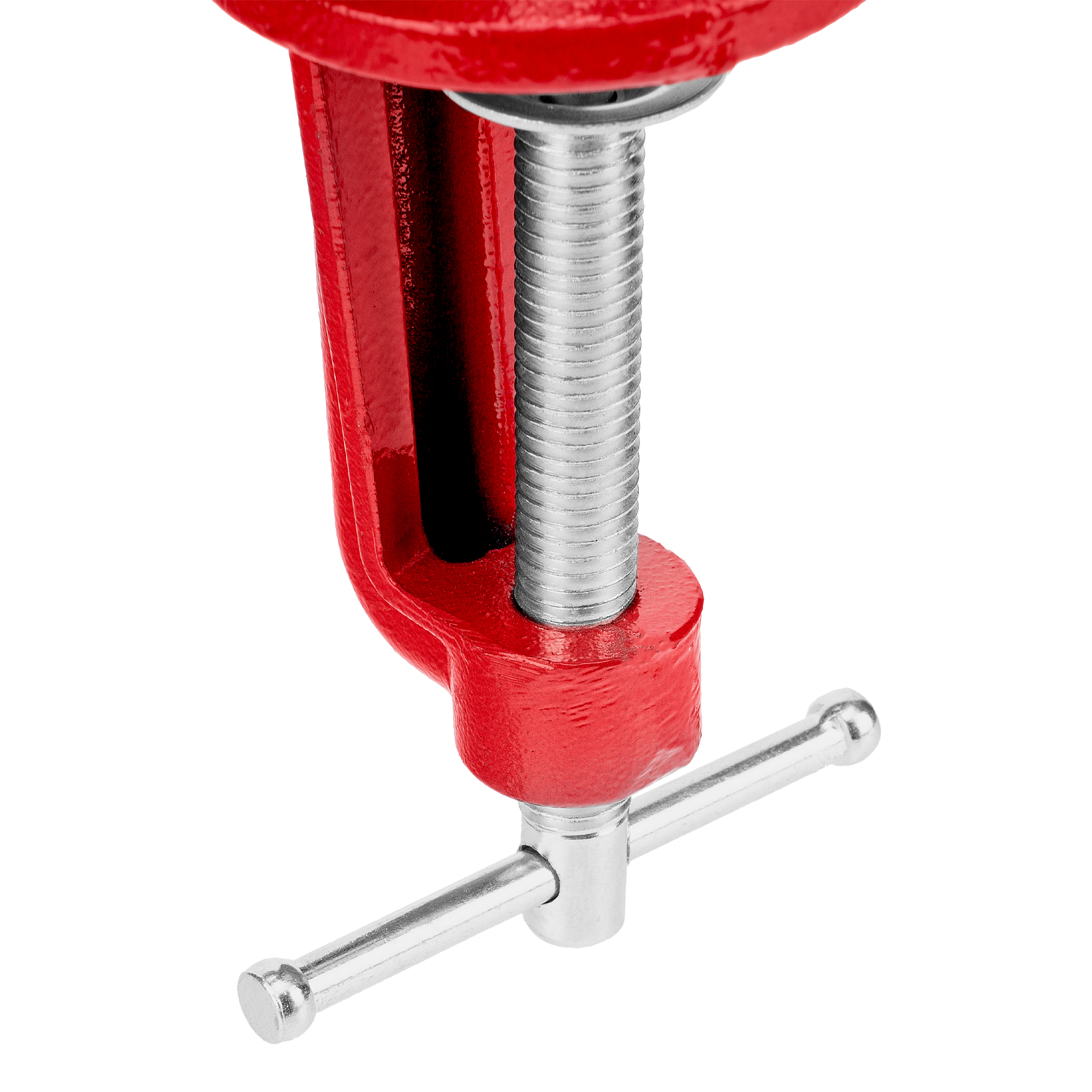 - Простая подготовка к работе — тиски надежно фиксируются на рабочем столе при помощи струбцины с винтовым зажимом.