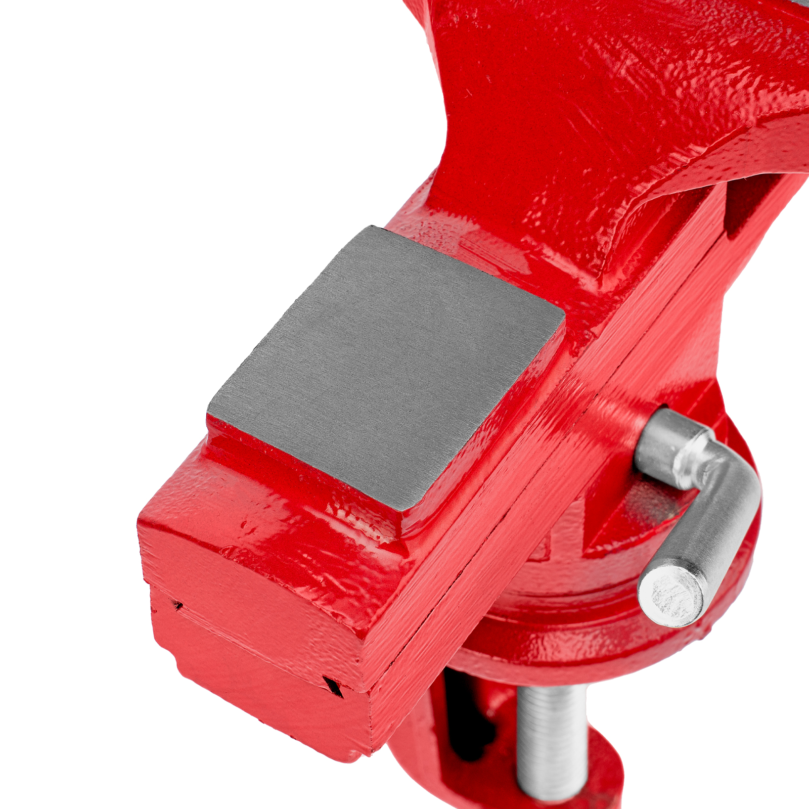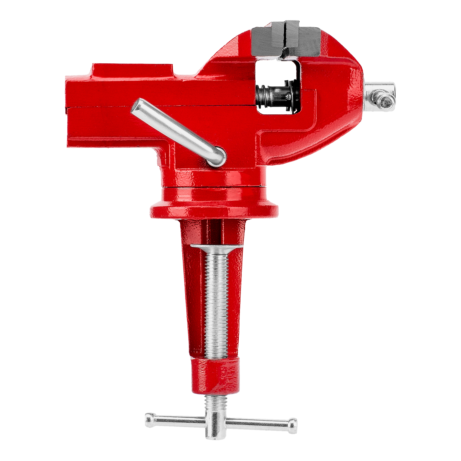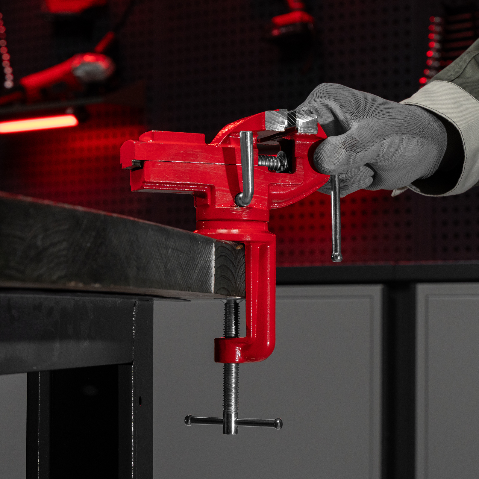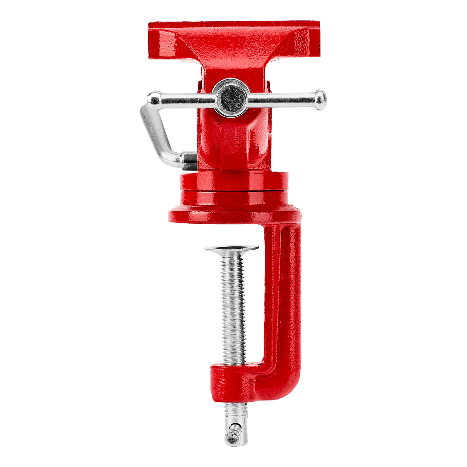 - Простая подготовка к работе — тиски надежно фиксируются на рабочем столе при помощи струбцины с винтовым зажимом.