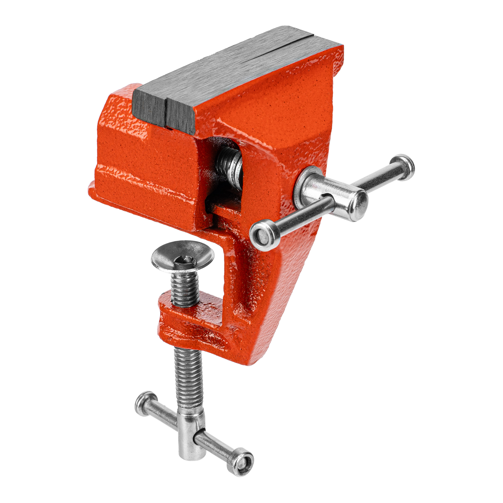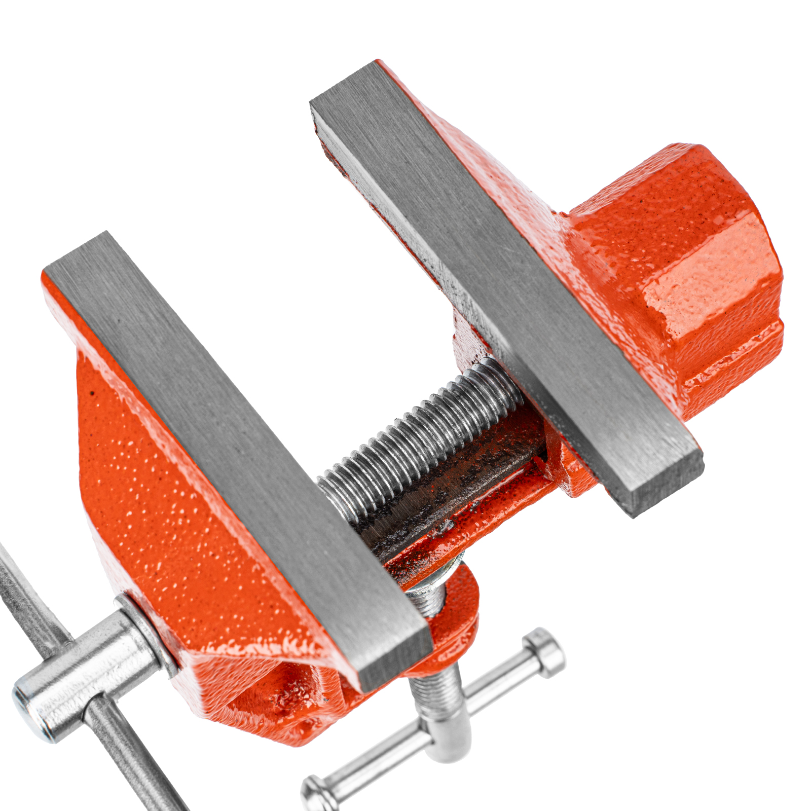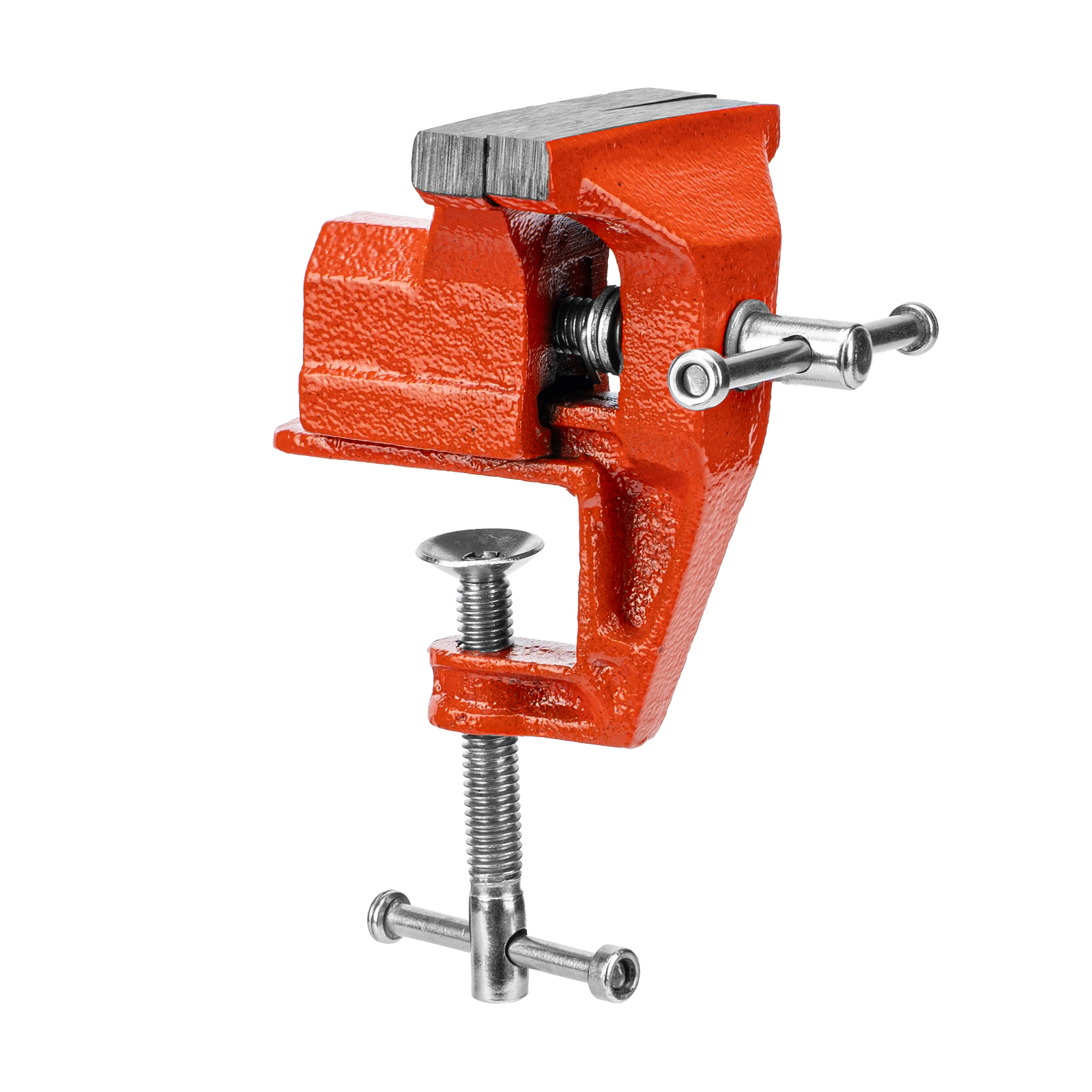 - Простое использование — винтовой зажимной механизм позволяет легко устанавливать и снимать тиски с рабочего стола.