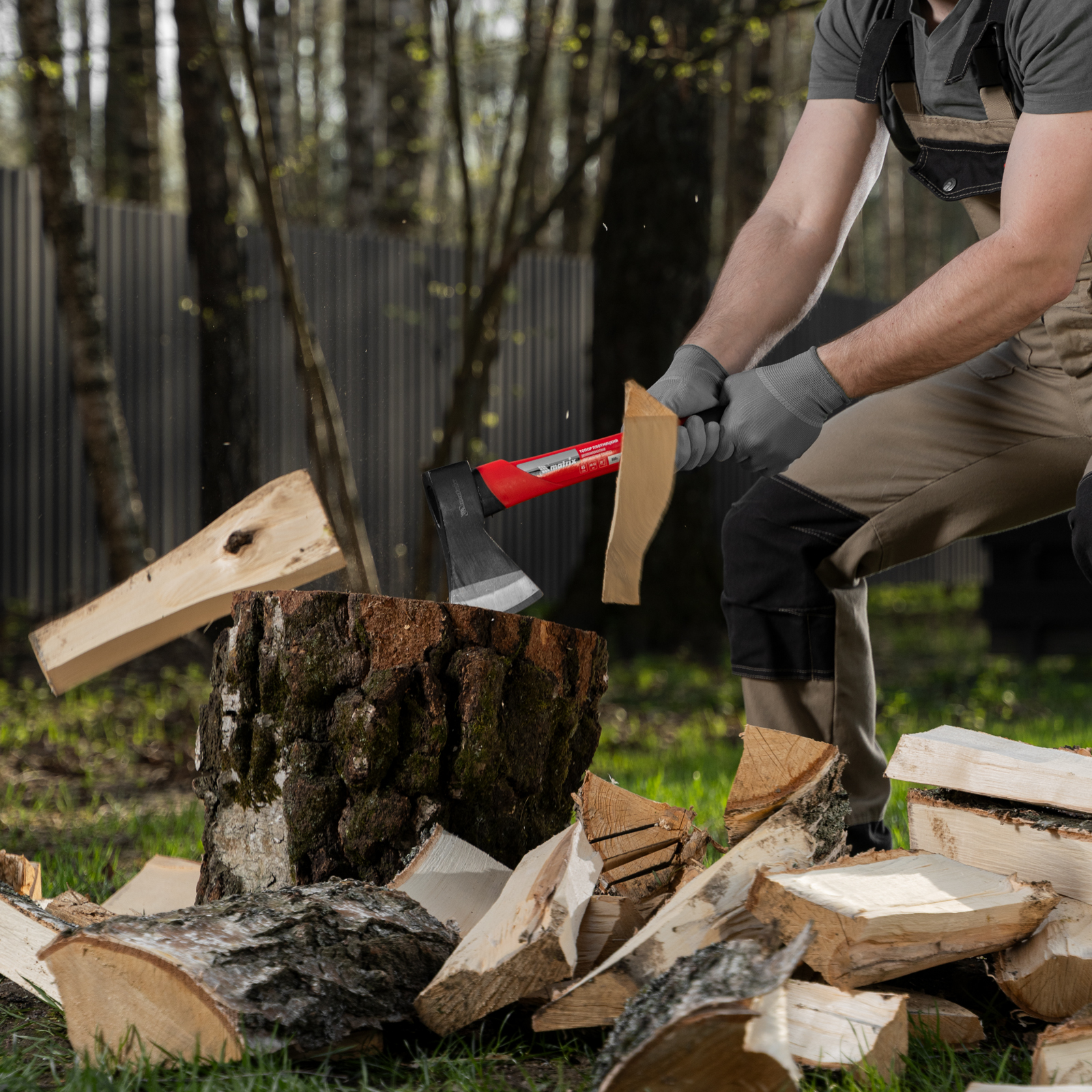 Топор Matrix 21413 длиной 450 мм, с рабочей частью весом 800 г и эргономичной фибергласовой рукояткой, используется для колки дров, заострения колышков, вырубки кустов, рубки сучьев, а также выполнения других работ. Полукруглое лезвие в сочетании с оптимальным соотношением длины и веса упрощает работу. Инструмент используется для решения бытовых задач.