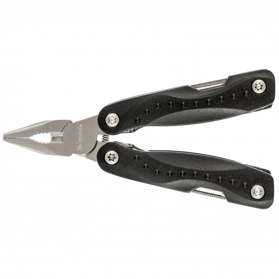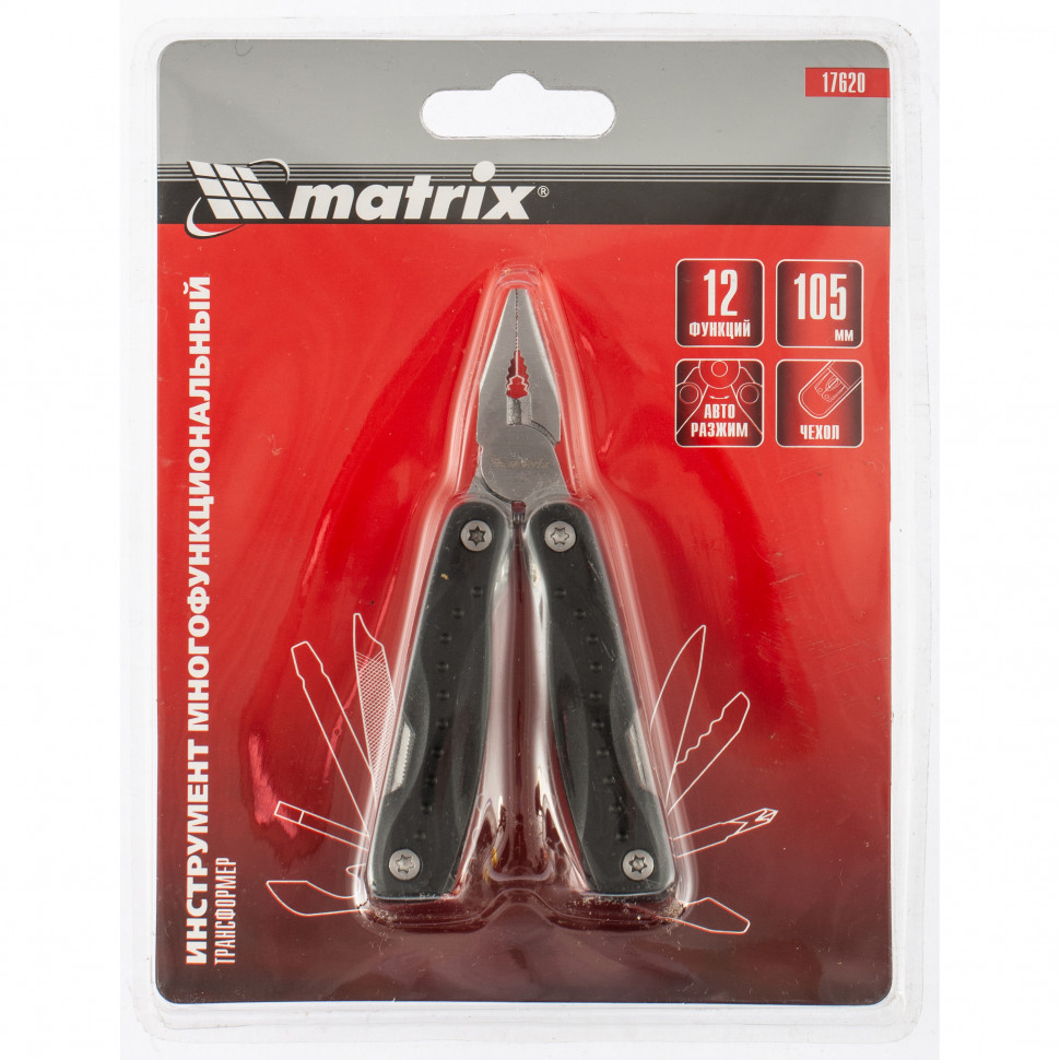 Трансформер Matrix 17620 — мультитул компактного размера, длиной 105 мм, с авторазжимом, выполняющий 12 функций и поставляющийся с чехлом. В него входят нож и пила для разрезания картона и других материалов, длинногубцы с захватом для полукруглых предметов и кусачками для перекусывания мягкой проволоки, отвертки для работы с резьбовыми соединениями, пилка для ногтей, а также открывалки для открывания бутылок и консервных банок. Инструмент можно использовать в гараже, также он пригодится дома, на даче, в походе и поездке, на охоте или рыбалке.