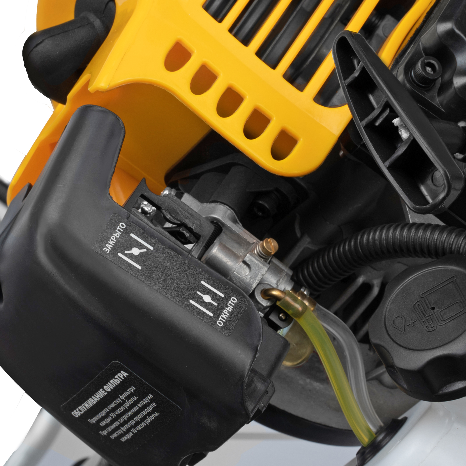 - Безопасность — блокиратор курка газа препятствует случайному запуску двигателя, прочный пластиковый кожух защищает пользователя от летящей травы, грязи и прочих твердых частиц.