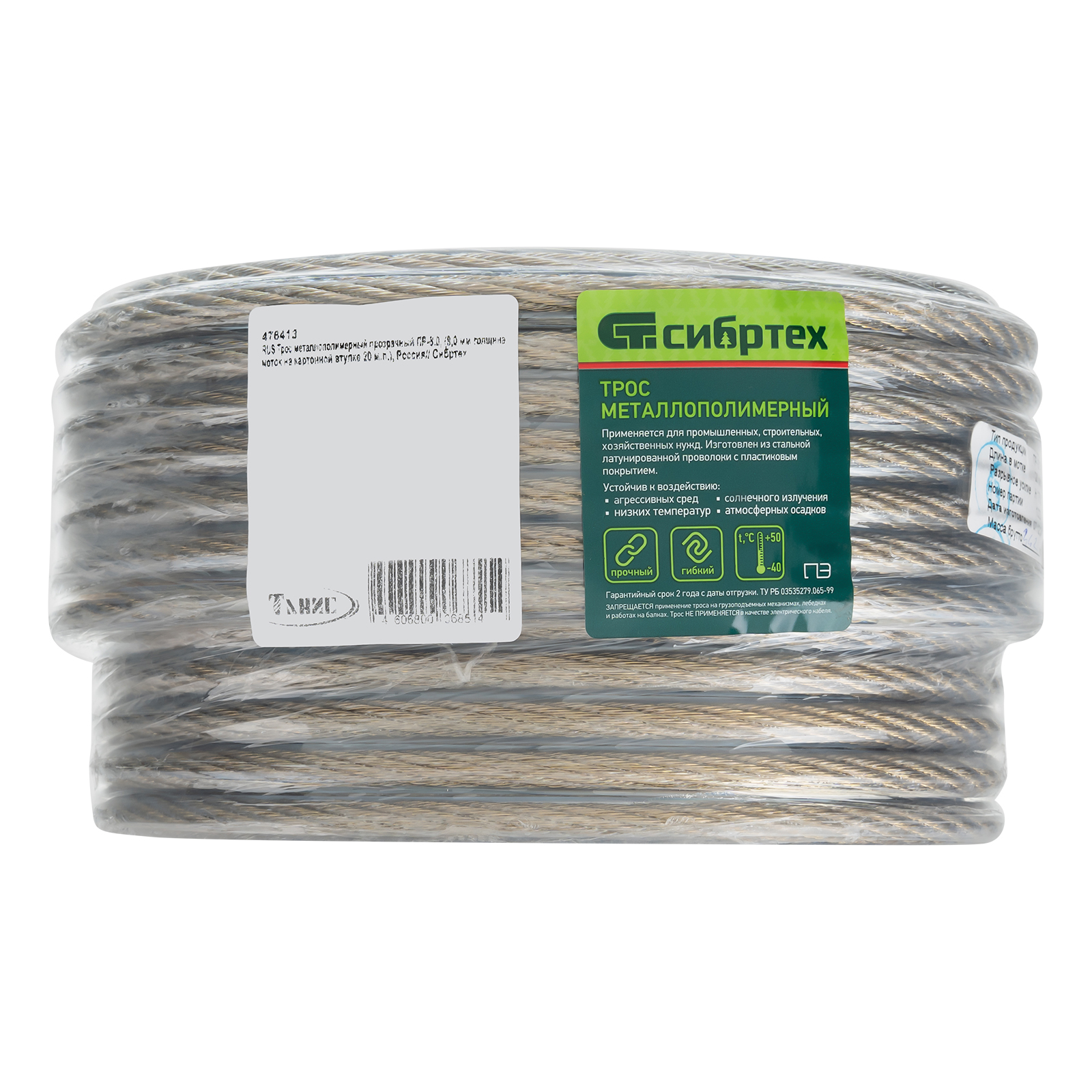Трос металлополимерный прозрачный ПР-8.0, толщина 8.0 мм, моток 20 метров Сибртех в Москве