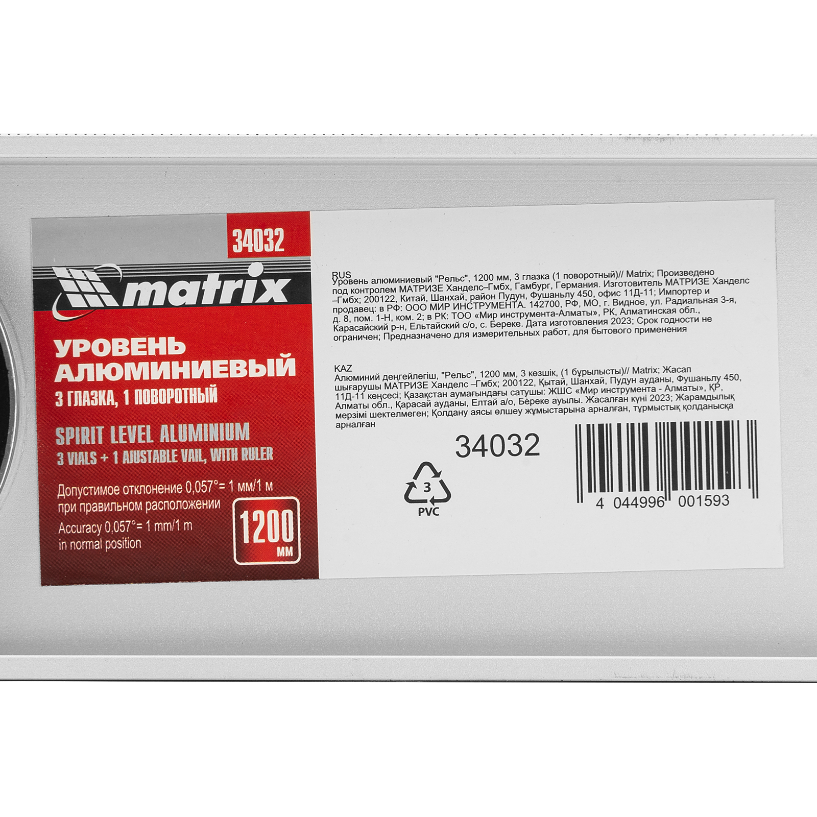 Уровень алюминиевый "Рельс", 1200 мм, 3 глазка (1 поворотный) Matrix в Москве