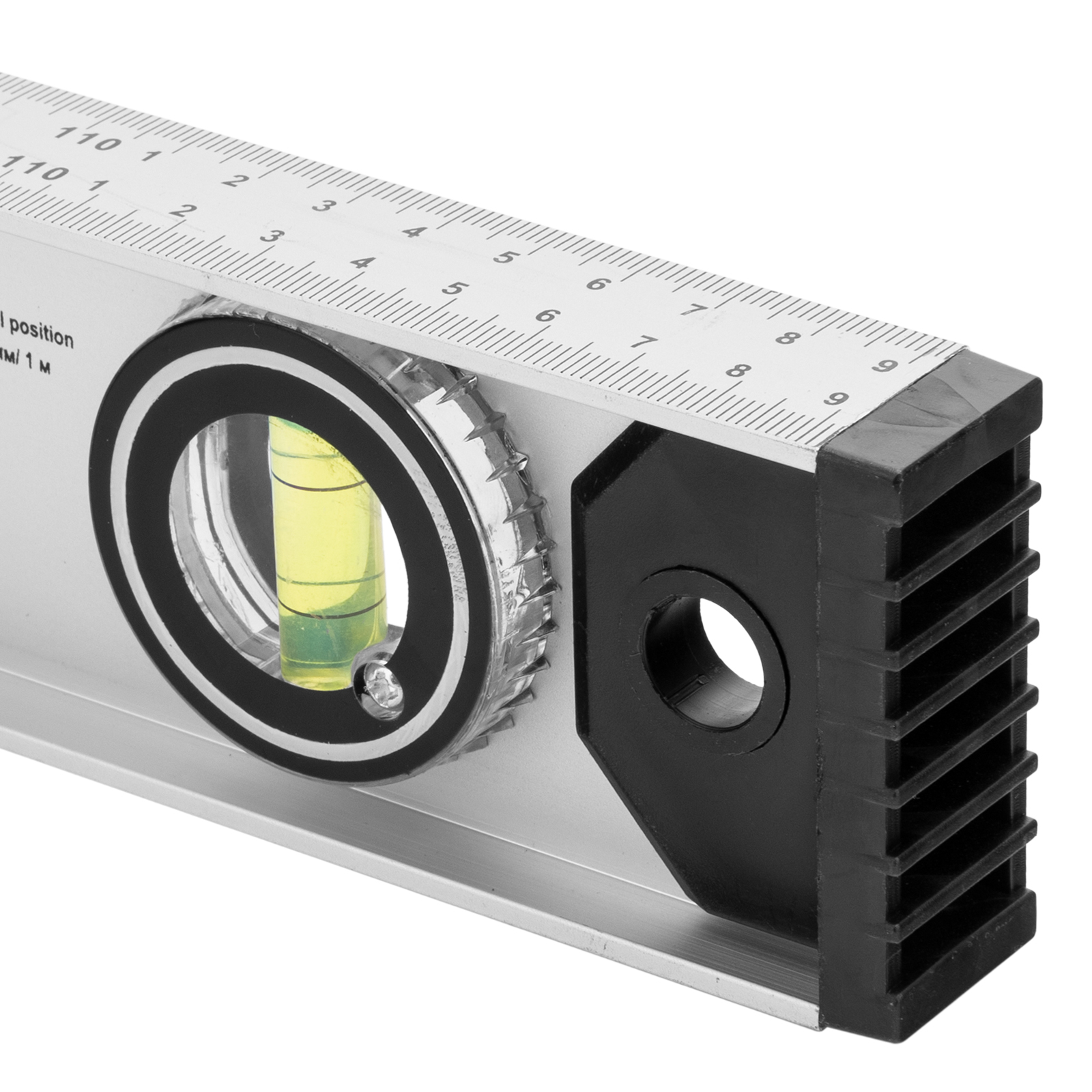 Алюминиевый уровень Matrix «Рельс» 34032 длиной 1200 мм имеет 3 глазка: 2 для проверки отклонений от заданной вертикали и горизонтали и 1 поворотный для проверки наклонных поверхностей.